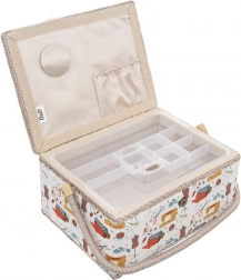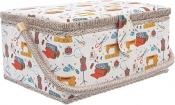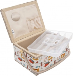 Elegantní košík na šití s rozměry 30 × 23 × 16 cm nabízí praktickou organizaci vašich nití, jehel a drobných pomůcek. Má pevnou konstrukci s látkovým potahem v krachovském motivu, skládací madlo pro snadné přenášení a magnetické zavírání proti náhodnému otevření. Uvnitř najdete vyjímatelný plastový organizér se 7 přihrádkami, kapsu a jehelníček ve víku.