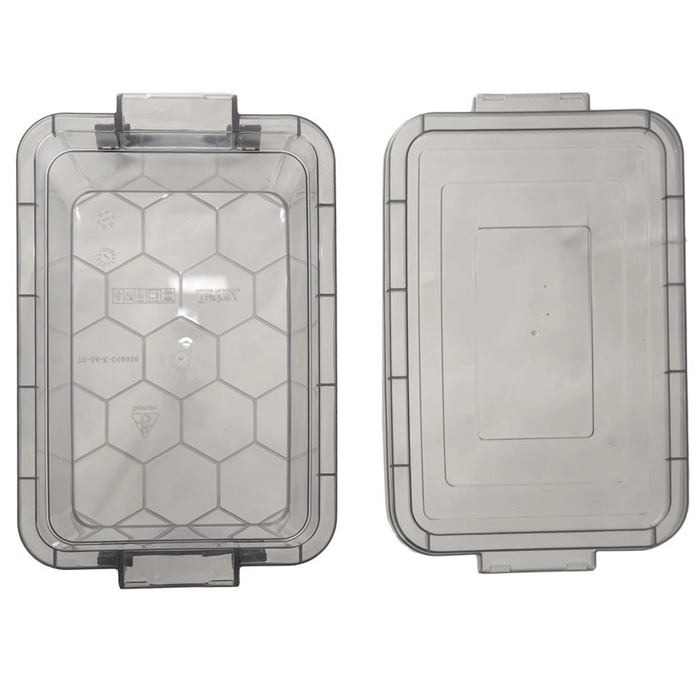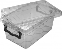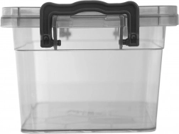 Praktický úložný box z kvalitního, zdravotně nezávadného plastu v tmavě šedém, transparentním provedení umožní okamžitou kontrolu obsahu bez nutnosti otevírání. Díky pevnému víku se dvěma bočními klipsy zůstane vše bezpečně uzavřené a chráněné před vlhkostí a nečistotami.