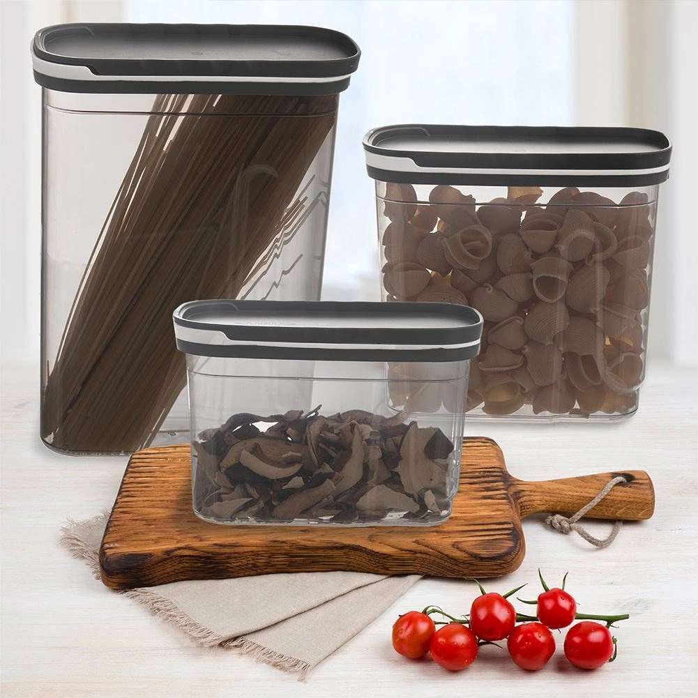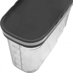 Dóza je vyrobena z kvalitního, odolného plastu bez BPA v elegantní šedé. Snáší teploty od -10 °C do +95 °C, lze ji mýt v myčce a používat v mikrovlnné troubě (bez víka). Praktická měrka po 250 ml v rozmezí 250–1250 ml zjednoduší přesné odměřování při vaření a pečení.