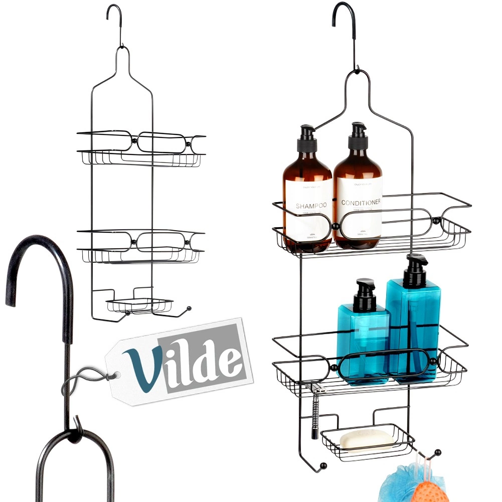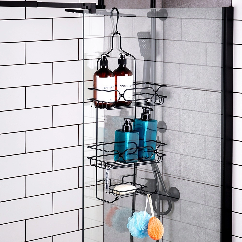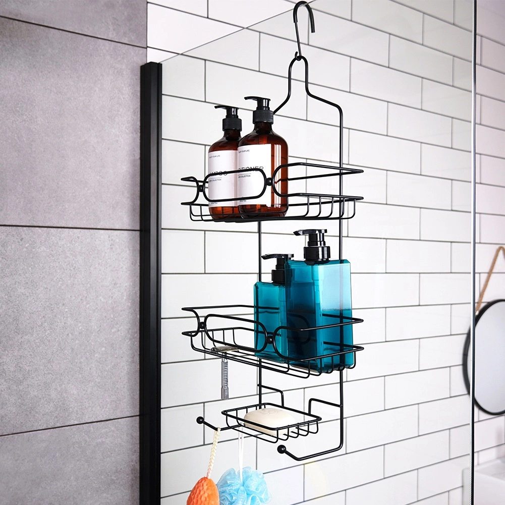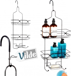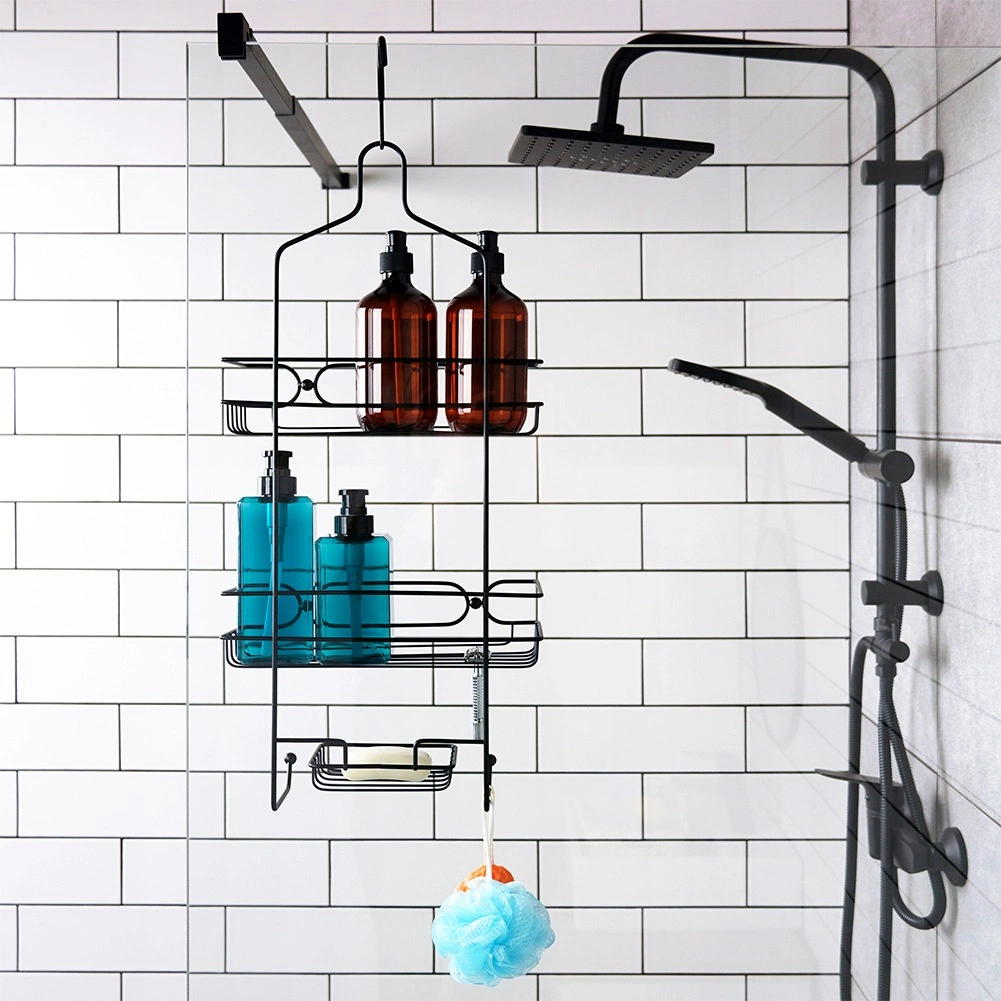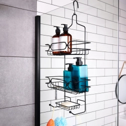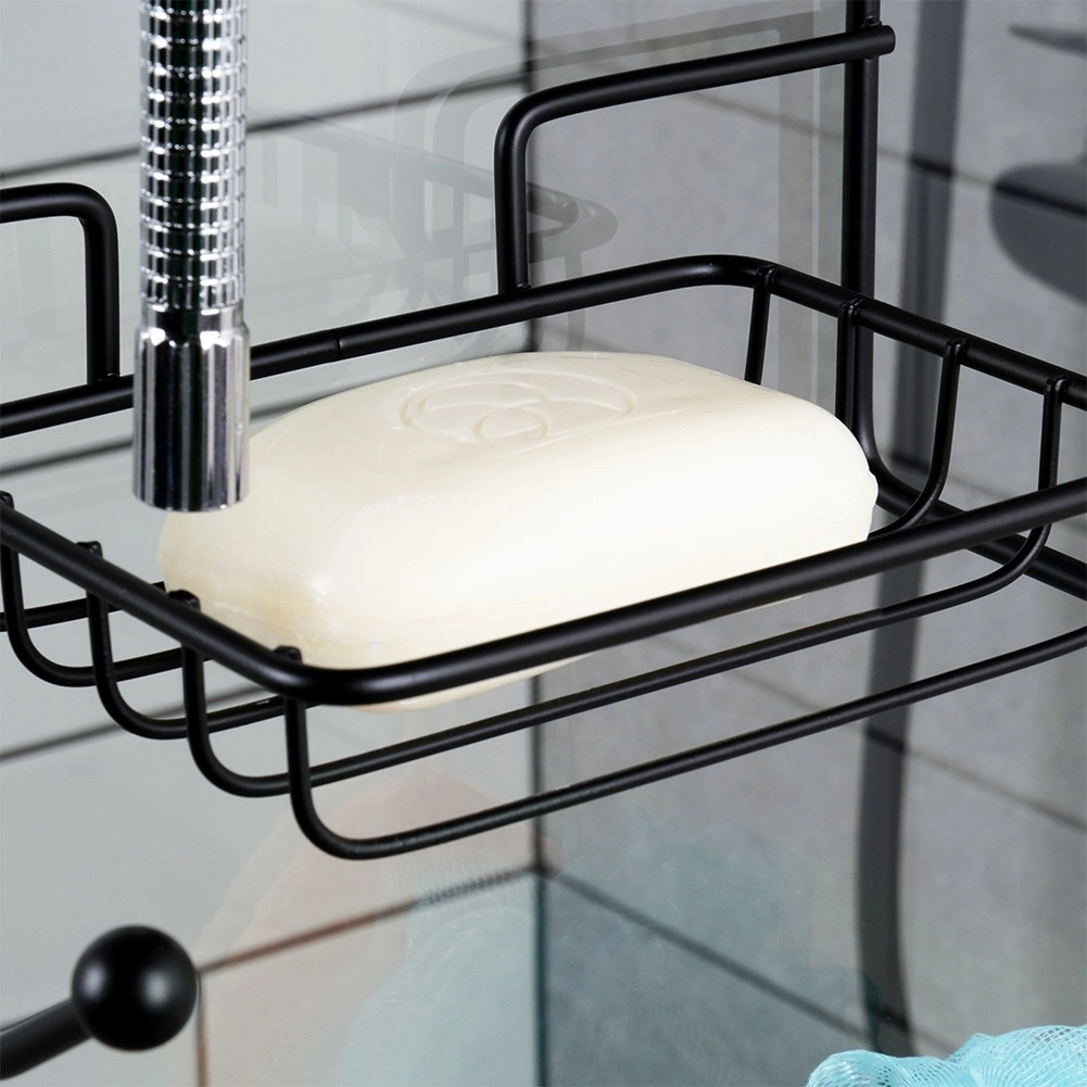 Praktická závěsná sprchová polička v elegantní černé barvě udrží vaši koupelnu přehlednou a stylovou. Nabízí montáž bez vrtání, odolnou kovovou konstrukci s antikorozní úpravou a gumou potažený hák pro bezpečné zavěšení bez poškrábání skla. Dvě prostorné police, mýdlenka a háčky na doplňky zajistí vše po ruce.