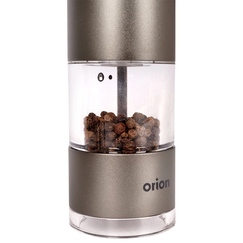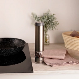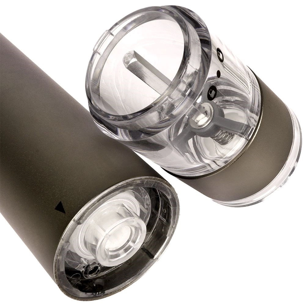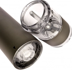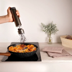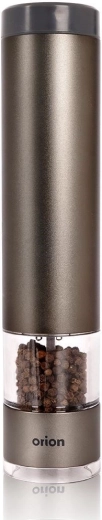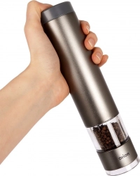 Elegantní elektrický mlýnek na sůl, pepř a další koření z hliníku v grafitové barvě zajistí čerstvě namleté koření stiskem jediného tlačítka. Disponuje keramickým mlecím mechanismem, plynulou regulací hrubosti a praktickou bezpečnostní blokací. Napájení na 6× AAA baterie pro pohodlné používání jednou rukou.