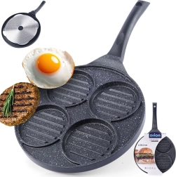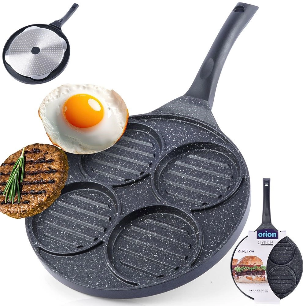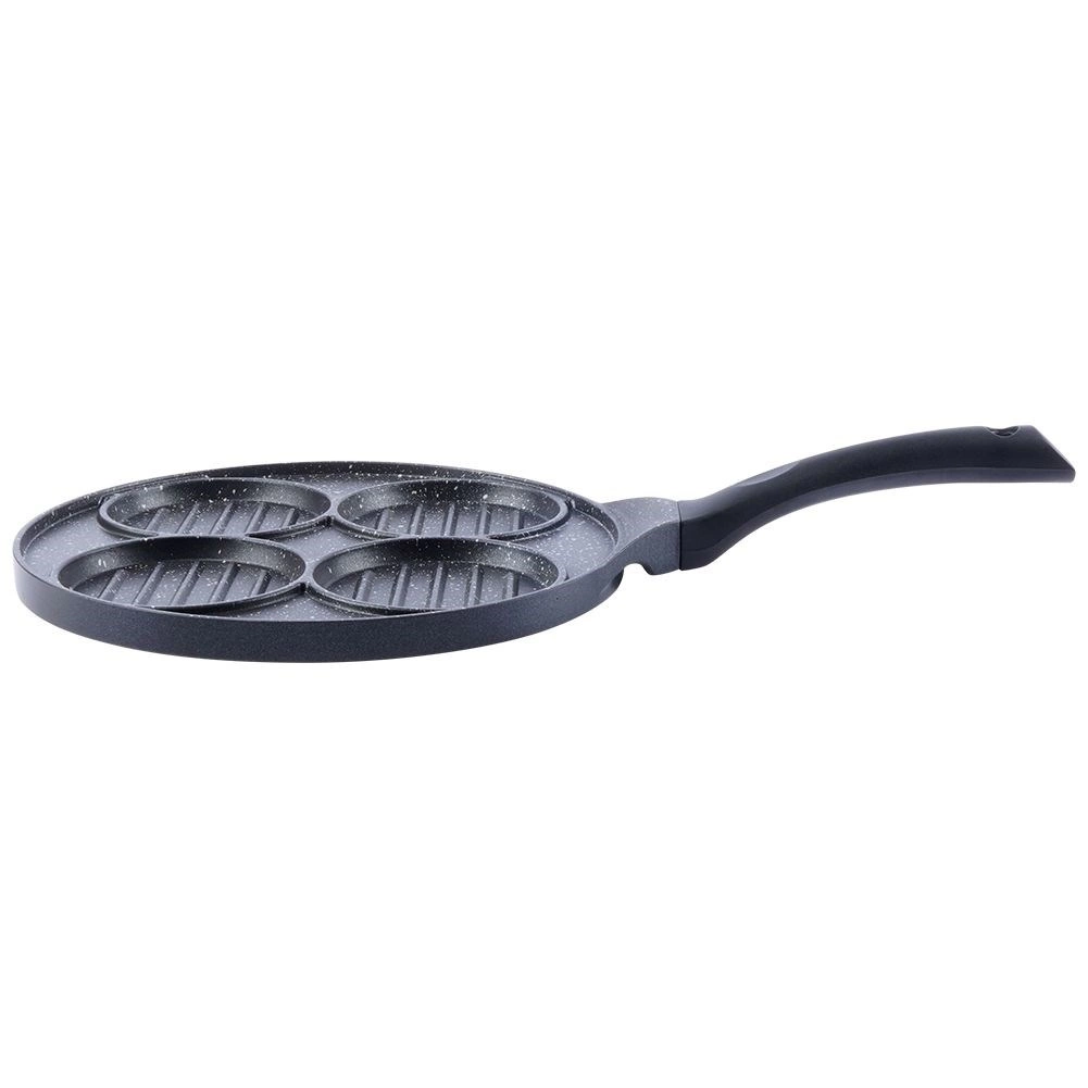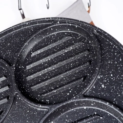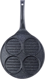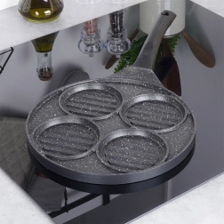 Tato víceúčelová pánev s průměrem 26,5 cm a čtyřmi oddělenými kruhovými sekcemi (každá cca 10 cm) vám umožní připravit burgery, volská oka, lívance či zeleninové placičky současně a bez míchání chutí. Granitová nepřilnavá vrstva PFLUON GRANIT zajišťuje minimální připalování, menší spotřebu oleje a snadné čištění.