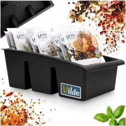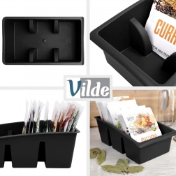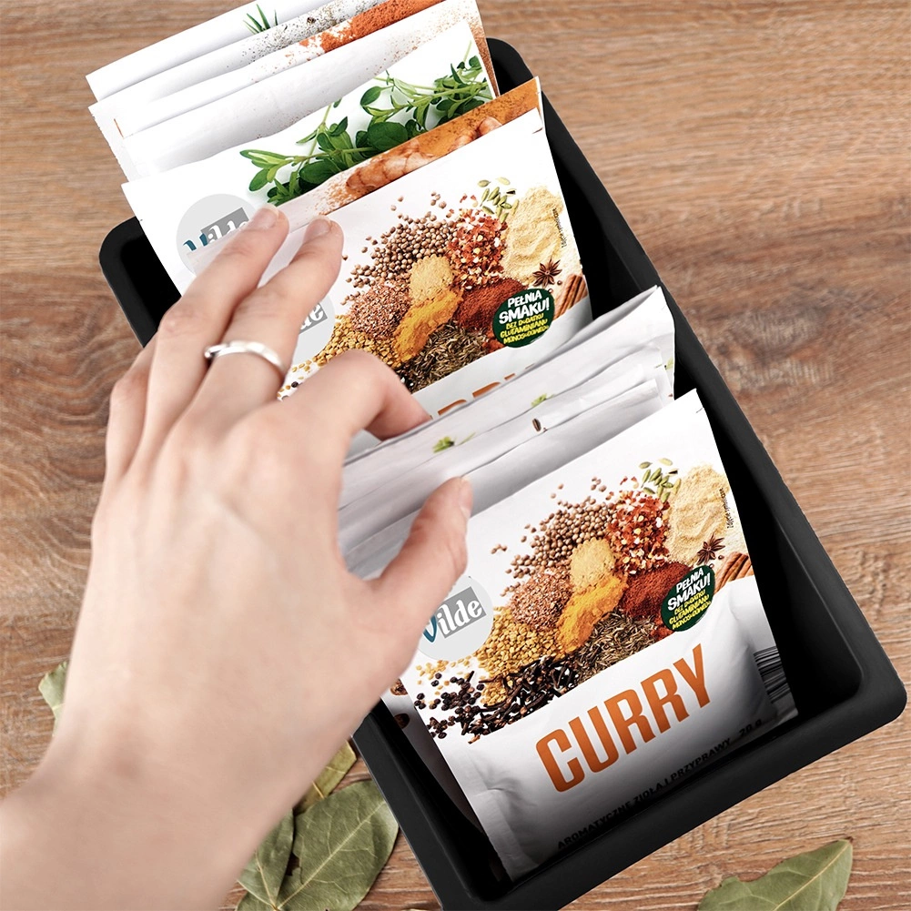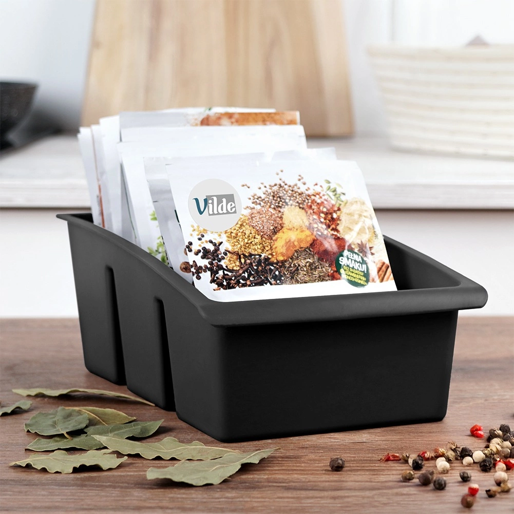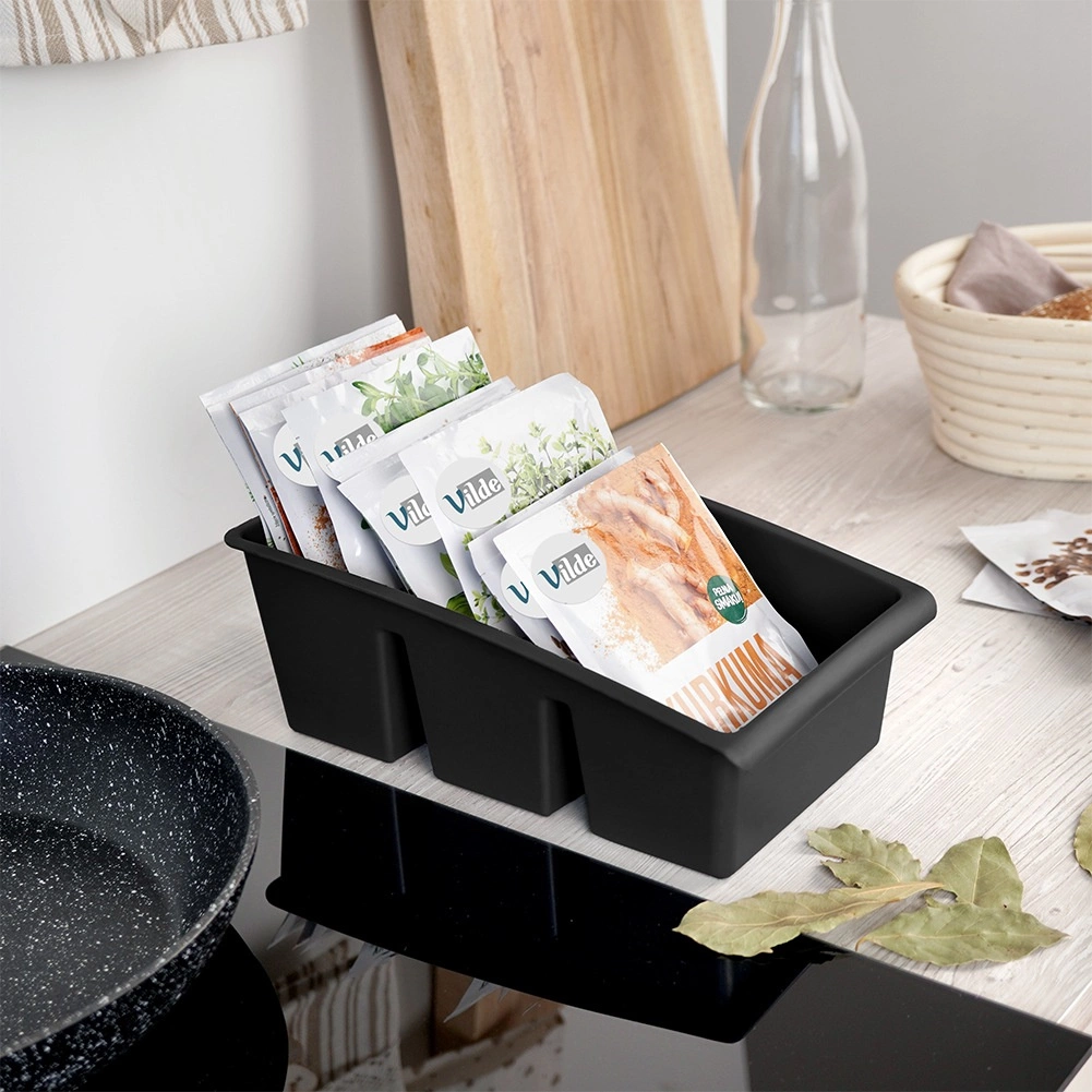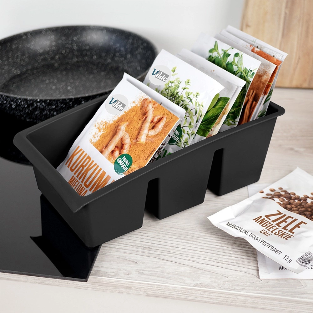 Tento praktický kuchyňský organizér je navržen pro přehledné uložení sáčků s kořením a bylinkami. Tři oddělené sekce udrží sáčky stabilně ve vzpřímené poloze, takže vždy rychle najdete to, co potřebujete. Černé provedení zapadne do každé moderní kuchyně a odolný materiál se snadno čistí.