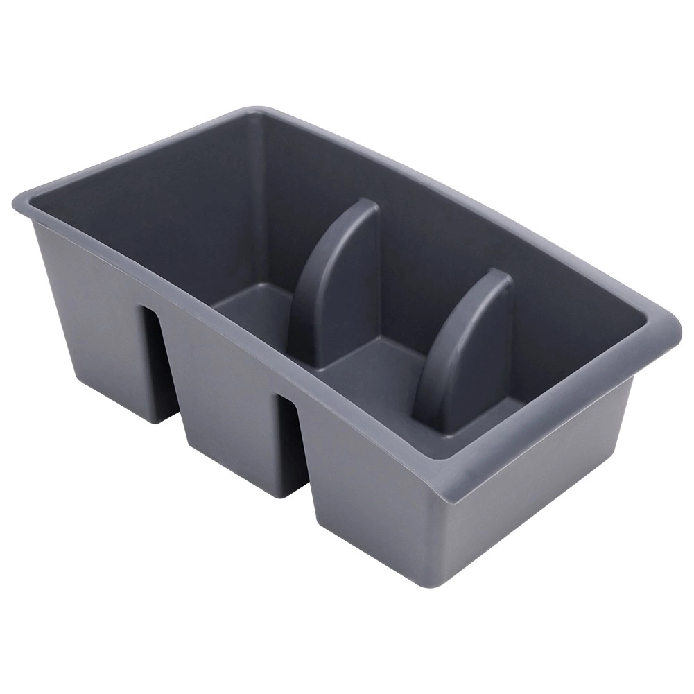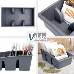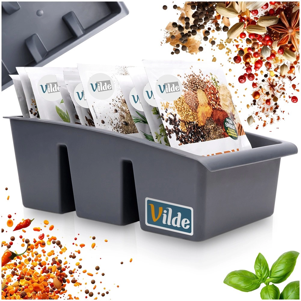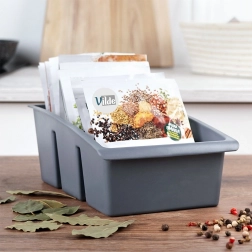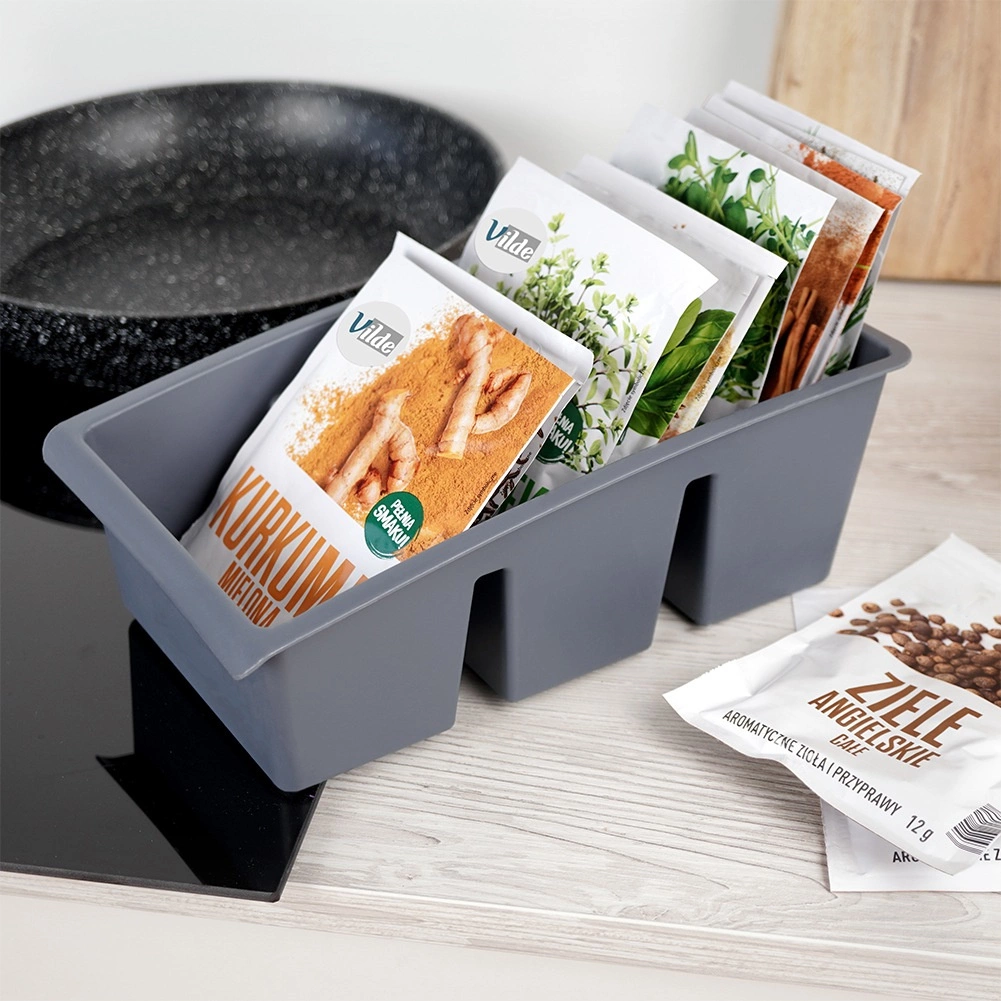 Udržte si pořádek v kuchyni s tímto praktickým organizérem na sáčky s kořením. Má tři prostorné přihrádky, přehledné třídění, snadný přístup a odolné provedení z lehkého plastu v šedé barvě. Skvěle se vejde do zásuvky, skříňky i na pracovní desku a pomůže vám mít všechny kořenící sáčky na jednom místě.