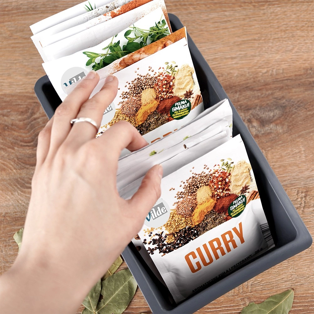 Praktický kuchyňský organizér udrží sáčky s kořením i bylinkami přehledně postavené a vždy po ruce. Díky dvěma vnitřním přepážkám je rozdělen na tři části, takže si koření snadno roztřídíte podle typu či použití. Nízký přední okraj zajišťuje dobrou viditelnost a rychlé vytažení správného sáčku.