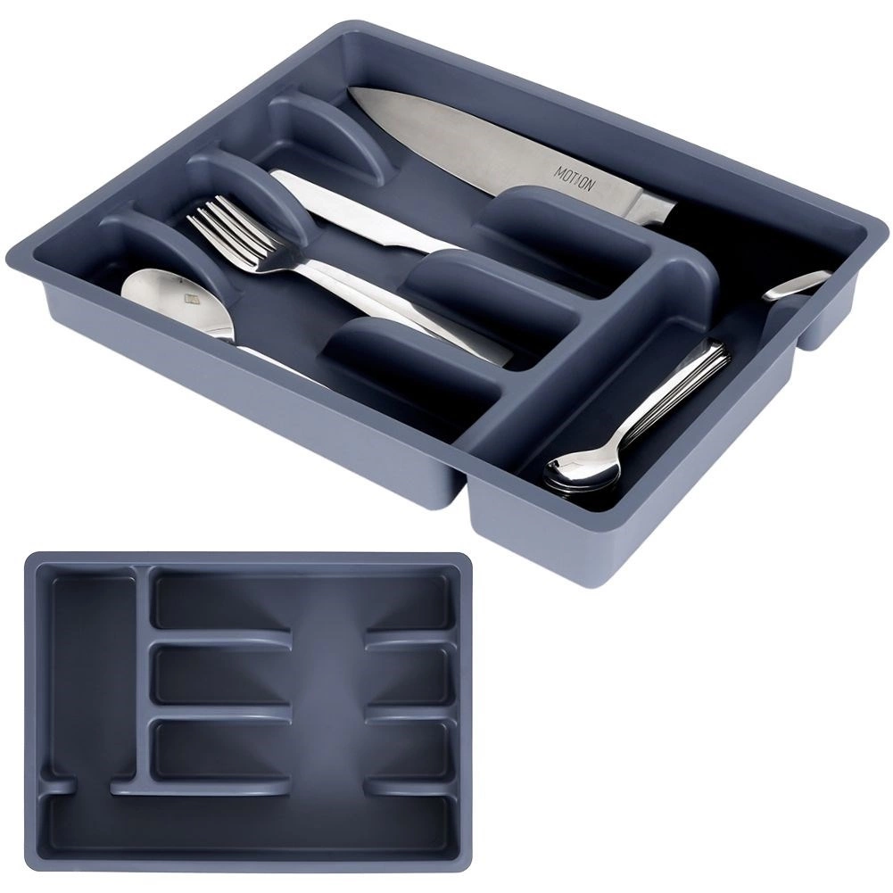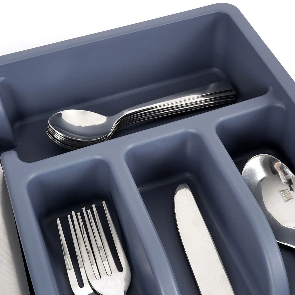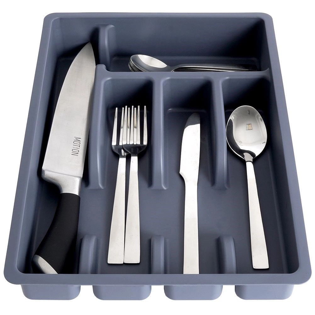 Tři sekce na příbory, samostatná přihrádka na lžičky a jedna dlouhá část na kuchyňské náčiní udrží vše na svém místě.