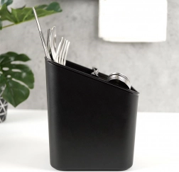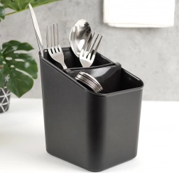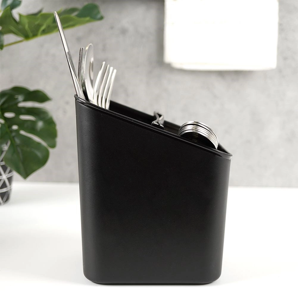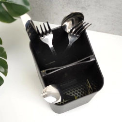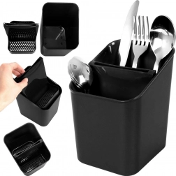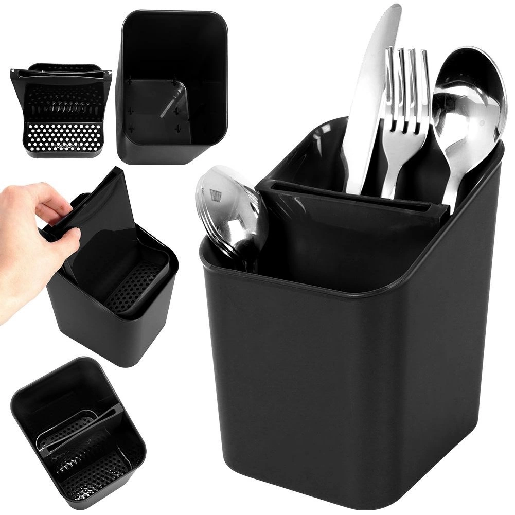Elegantní a funkční odkapávač na příbory v nadčasové černé barvě udrží vaši kuchyň organizovanou a čistou. Díky vyjímatelnému separatoru snadno rozdělíte příbory, a po jeho vyjmutí získáte prostornou nádobu s jednou komorou. Perforované dno umožňuje rychlý odtok vody, takže příbory nestojí ve vlhku a pracovní deska zůstává suchá.