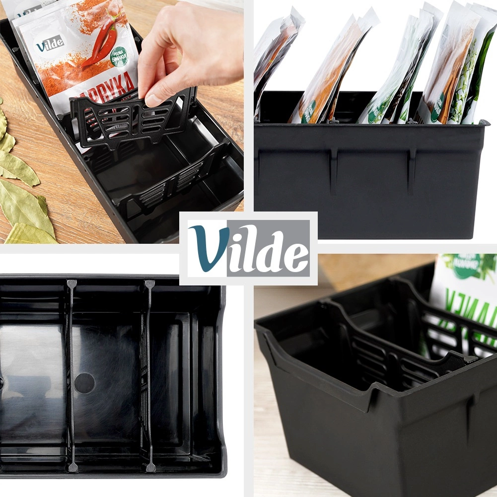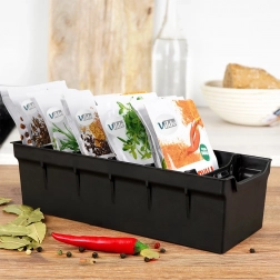Uspořádejte si sáčkové koření přehledně a na dosah. Praktický box s přepážkami udrží sáčky ve svislé poloze, takže se snadno vytahují a nepřevracejí se. Organizér je z kvalitního, lehkého a odolného plastu, který zaručuje dlouhou životnost a snadnou údržbu.