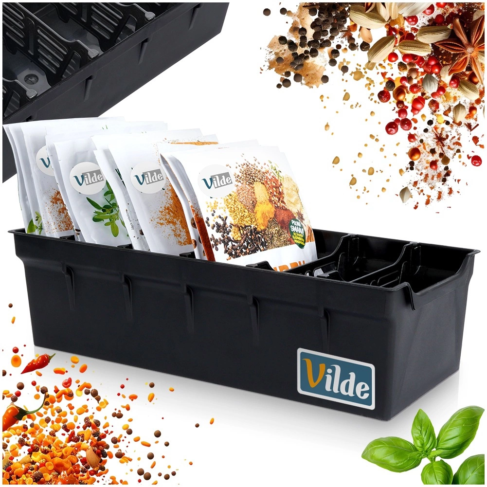 Díky pěti oddělovačům si koření rychle roztřídíte podle druhu či použití – bylinky, mletá koření, směsi, pečicí přísady a další. Ideální do zásuvek i polic, pro otevřené i uzavřené sáčky. Elegantní černé provedení se hodí do každé kuchyně a pomáhá udržet pořádek a přehlednost.