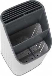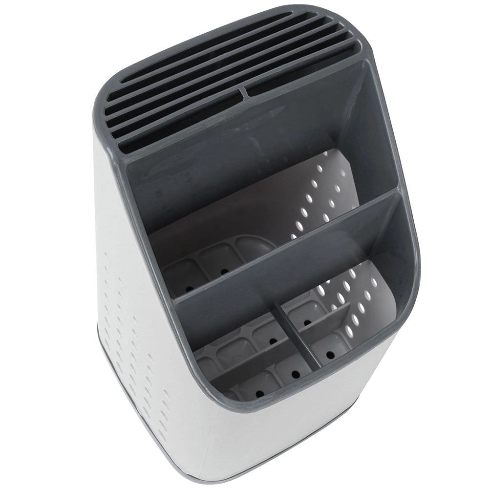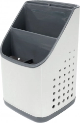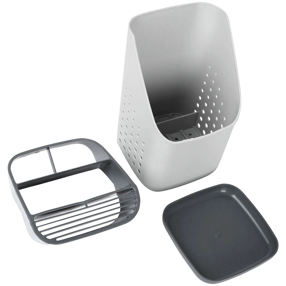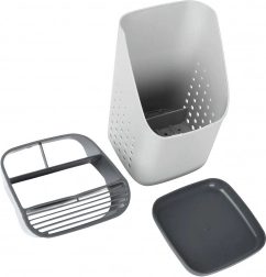 Praktický šedý odkapávač a organizér udrží vaše příbory, nože a kuchyňské náčiní vždy po ruce a přehledně rozdělené. Díky vícekomorovému členění, odnímatelné odkapávací misce a ventilačním perforacím příbory rychle osychají, nestojí ve vodě a kuchyňská linka zůstává čistá. Lehký a odolný plast v kombinaci světle šedé a grafitové barvy se hodí do každé moderní kuchyně.