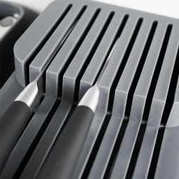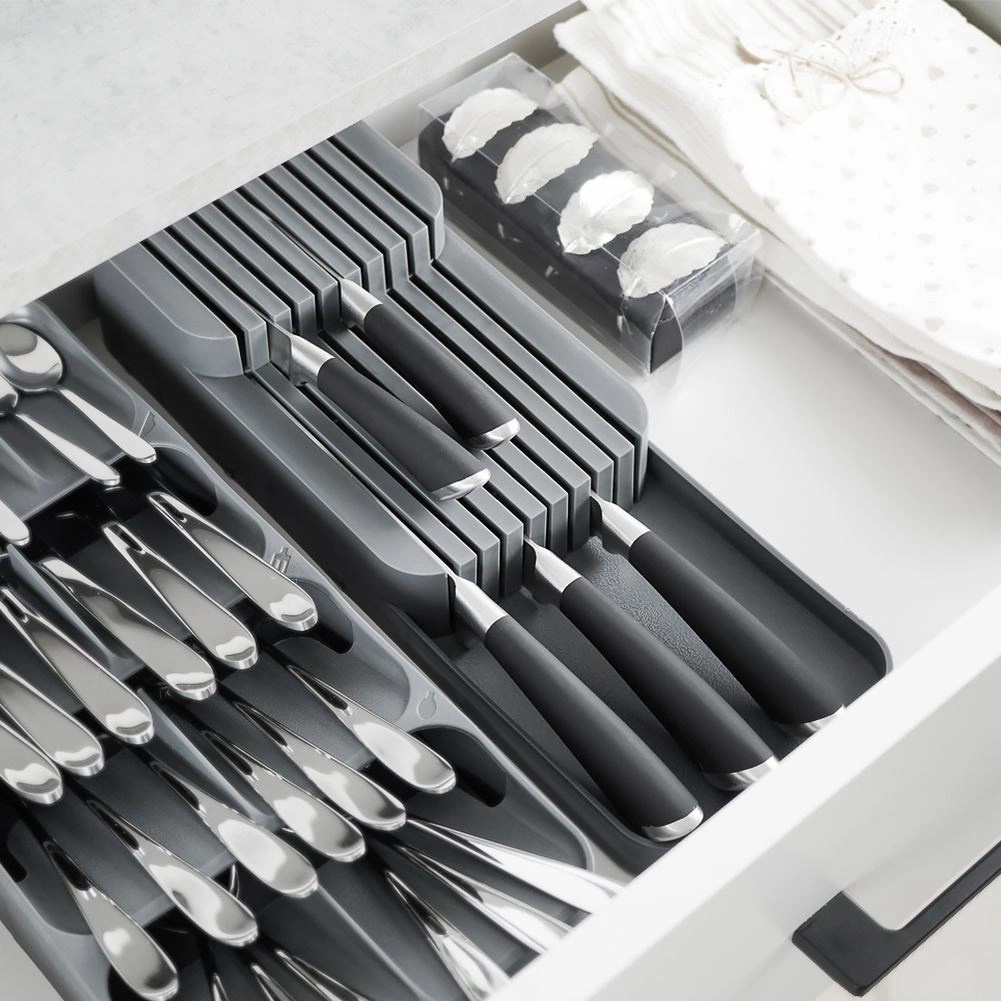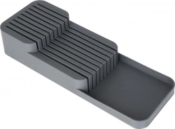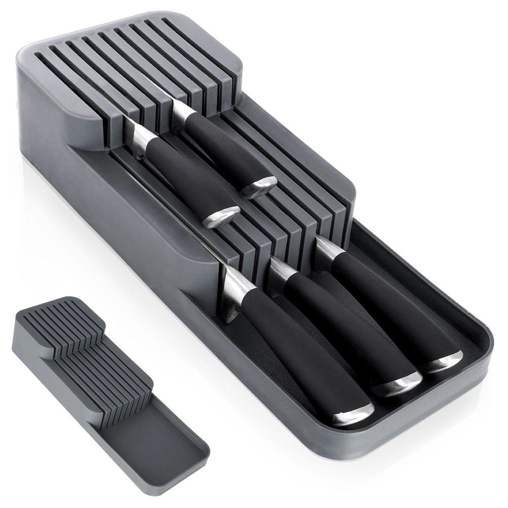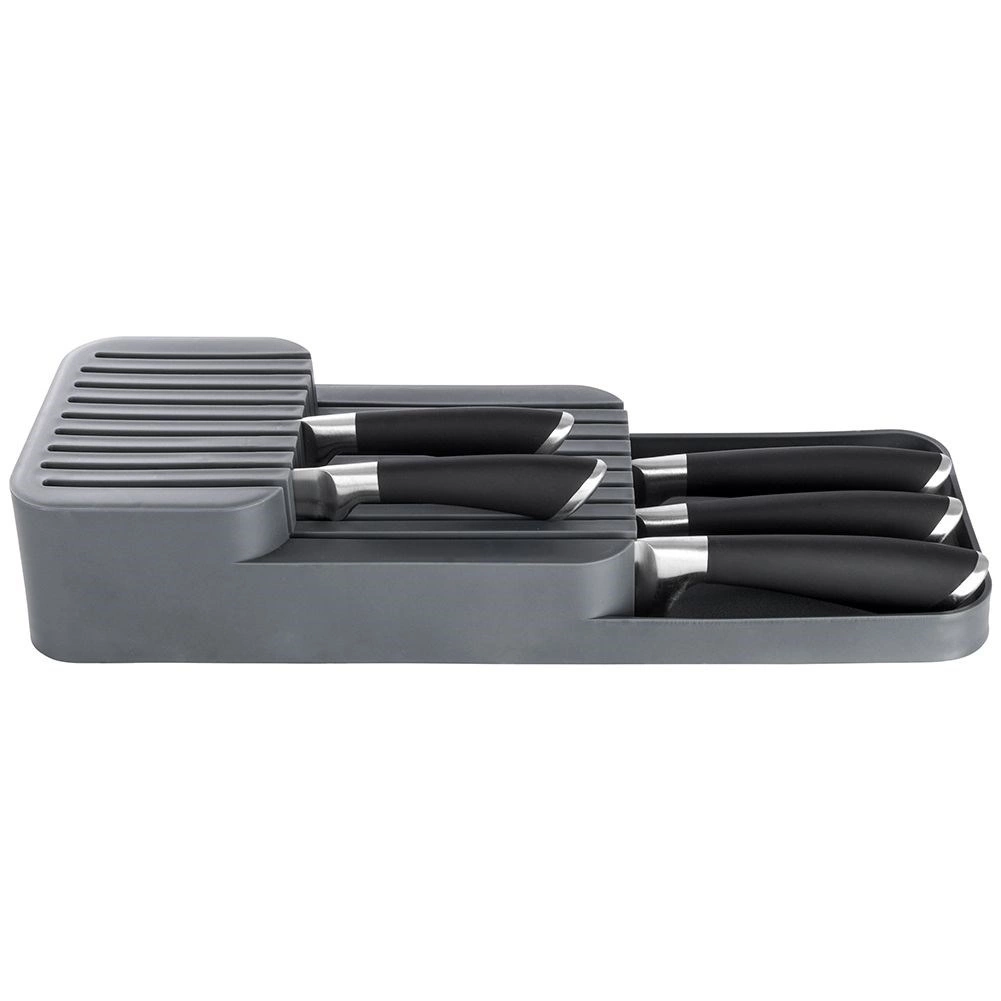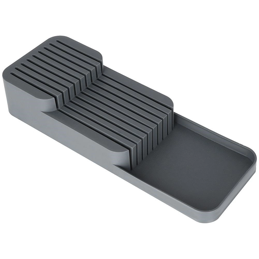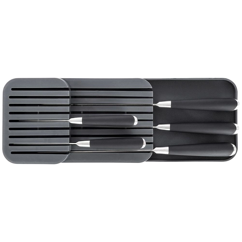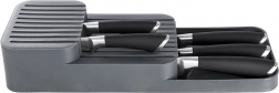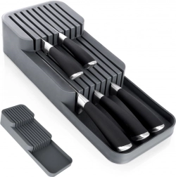 Tento praktický organizér na nože z odolného plastu udrží vaše kuchyňské náčiní přehledné a v bezpečí. Díky promyšlené konstrukci se nože ukládají na dvou úrovních, takže zabírají minimum místa a přitom zůstávají snadno dostupné. Šedá barva a čistý design skvěle zapadnou do každé moderní kuchyně.