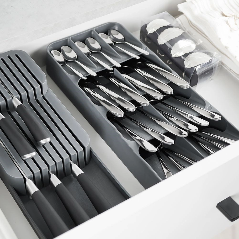 Udržte si pořádek v kuchyni s kompaktním organizérem na příbory Vilde. Díky chytré, víceúrovňové konstrukci a až 9 přihrádkám nabízí maximální úsporu místa, přehledné třídění vidliček, lžic, nožů i malých lžiček a zároveň bezpečné uložení nožů. Vyroben z odolného plastu v elegantní šedé barvě a přizpůsoben tak, aby seděl do většiny kuchyňských zásuvek.