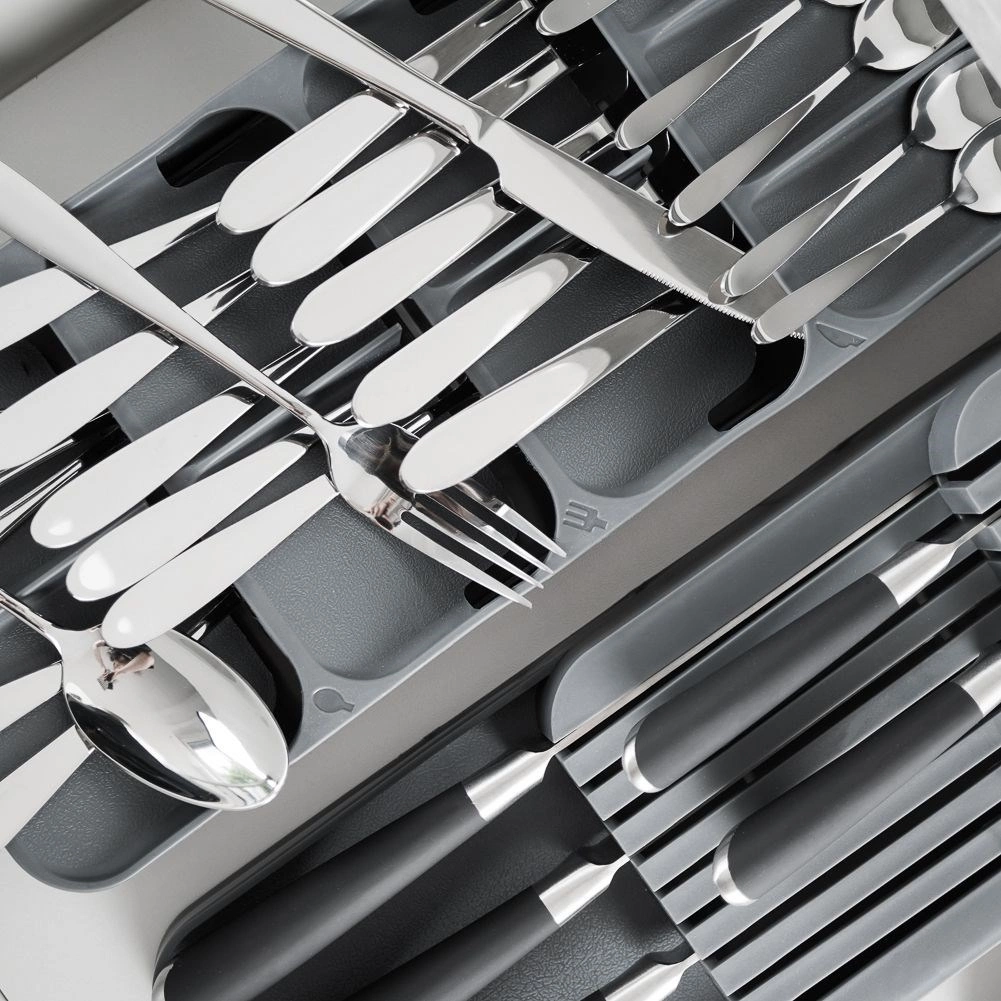 Devět promyšleně rozvržených přihrádek a víceúrovňové uspořádání udrží všechny příbory na svém místě a přehledně po ruce.