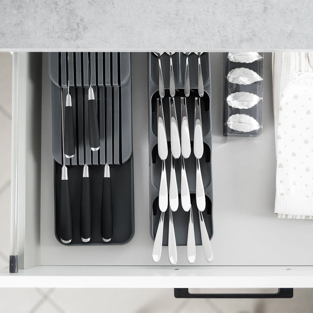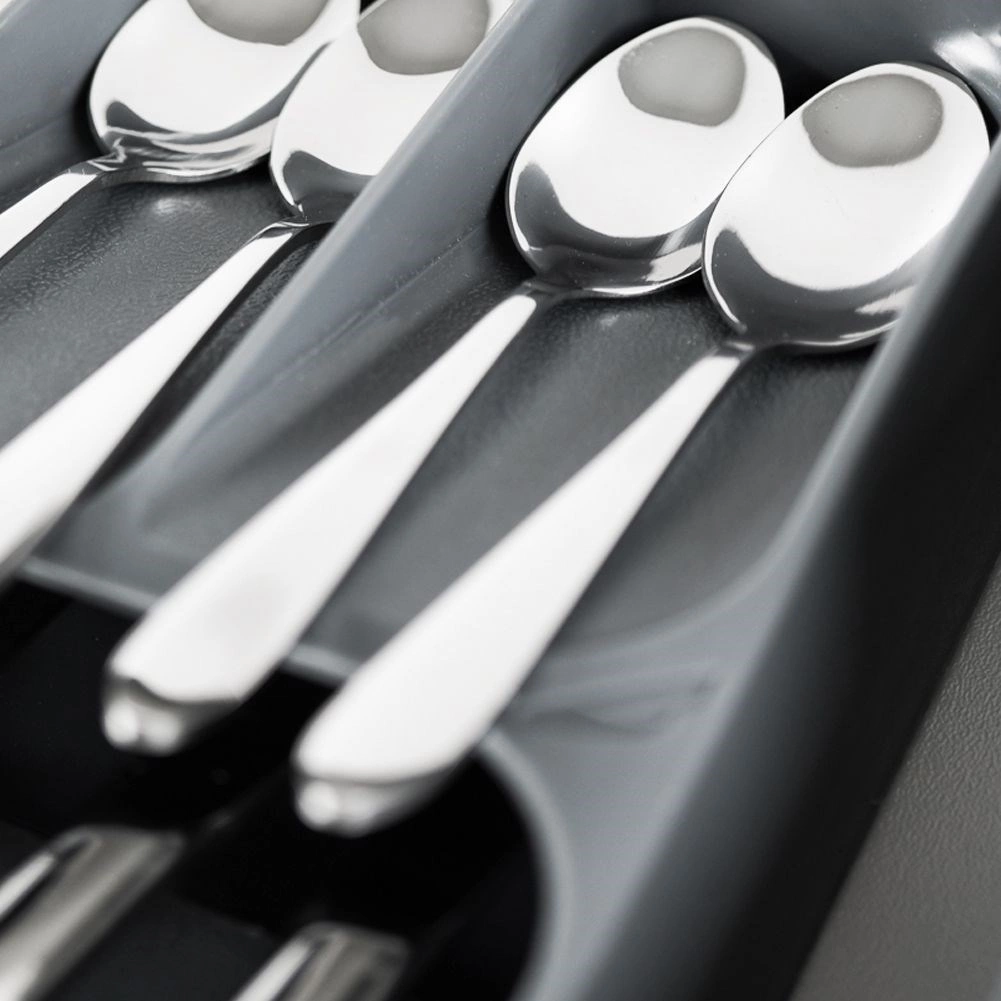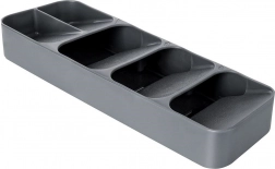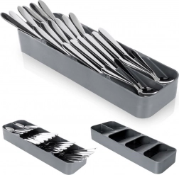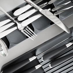 Odolné provedení z kvalitního plastu v elegantní šedé barvě zajišťuje snadné čištění i dlouhou životnost. Organizér je ideální pro ukládání lžic, vidliček, nožů i malých lžiček a vidliček, přičemž každý kus má své místo.