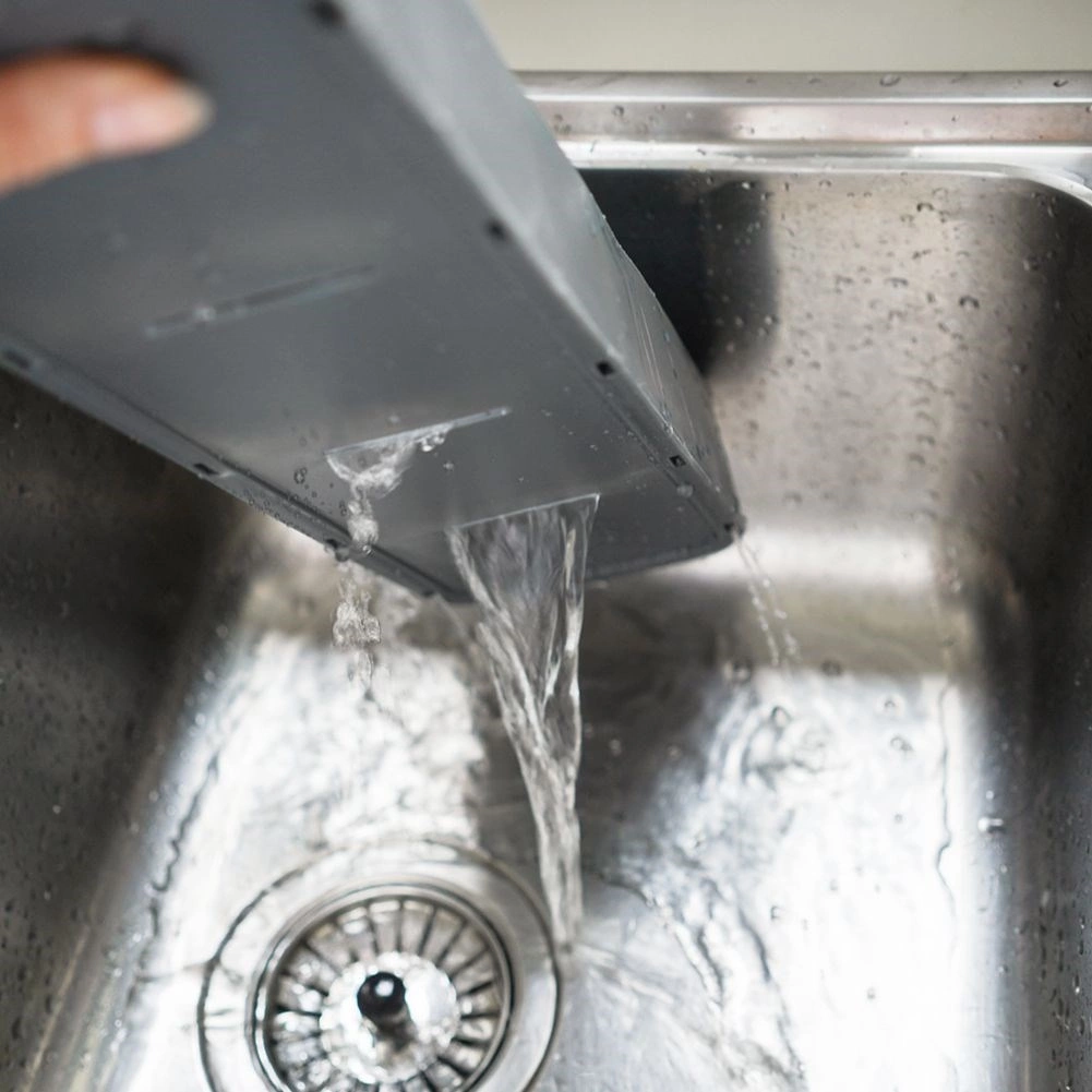 Hladký, pevný plast v šedé barvě je nenáročný na údržbu a vydrží každodenní používání.