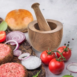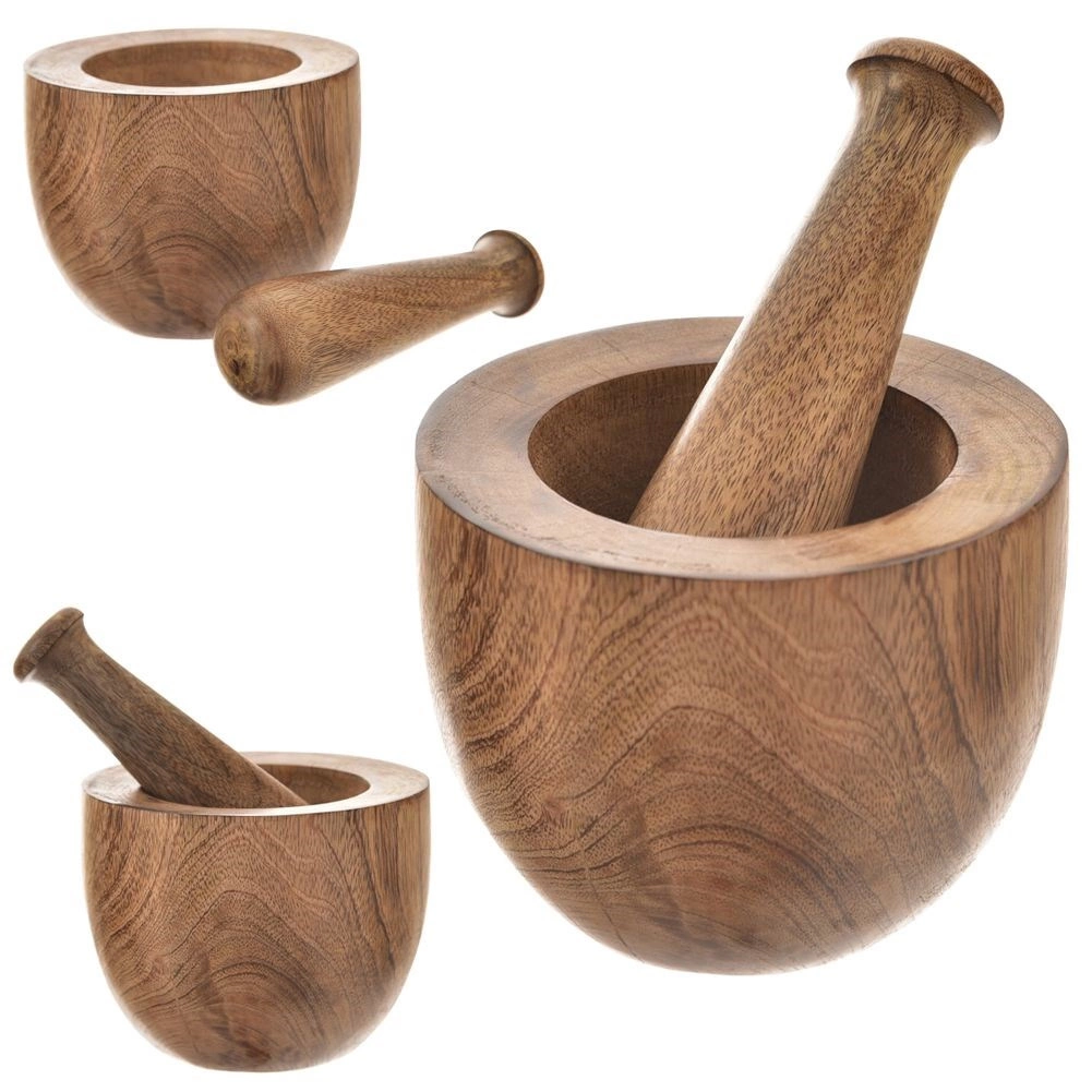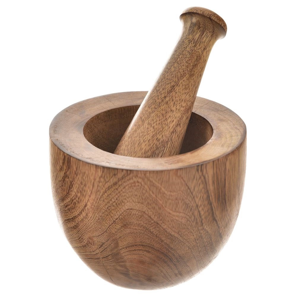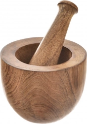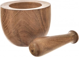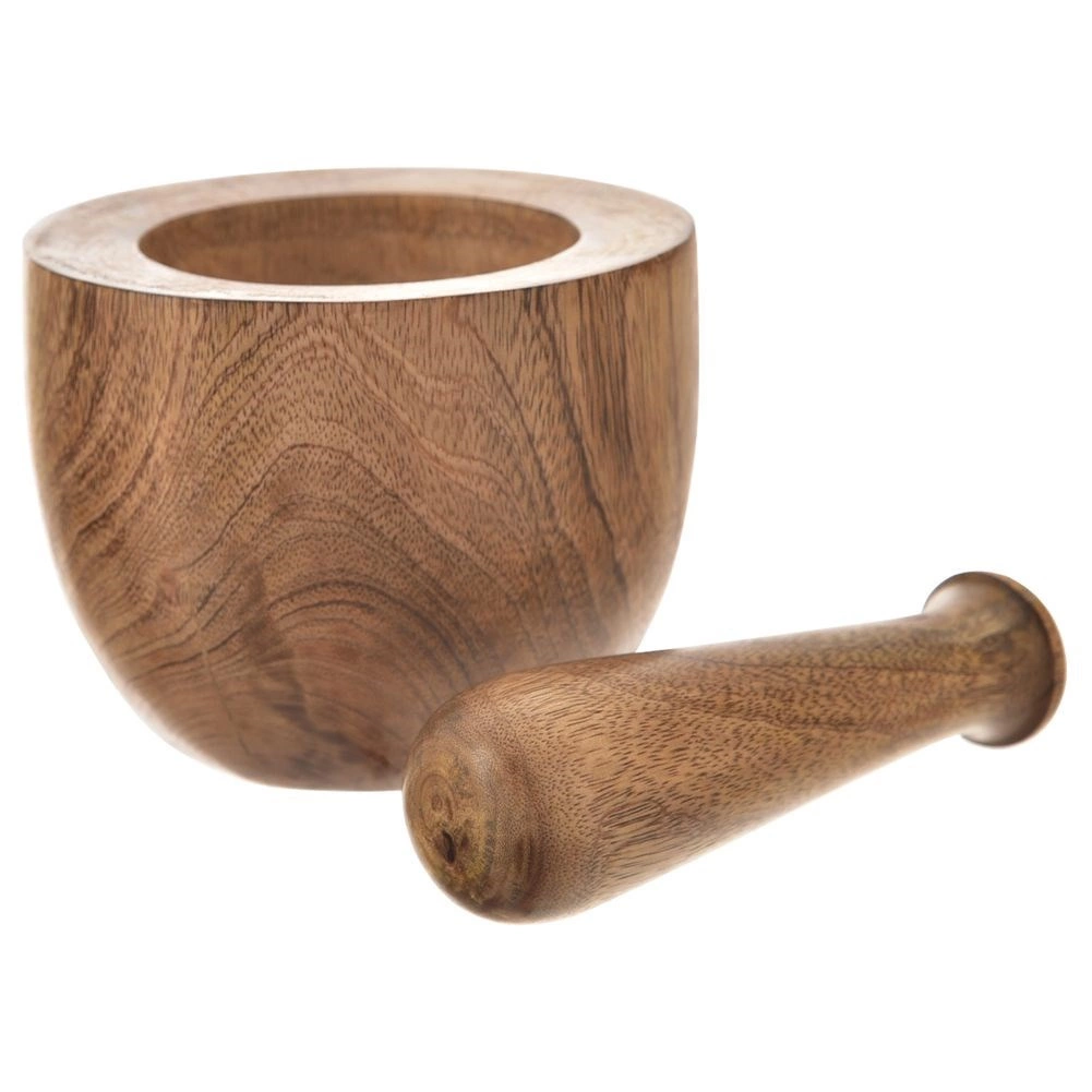 Robustní dřevěný hmoždíř z mangového dřeva s ergonomickým tloučkem pro snadné drcení a mletí bylinek, koření, ořechů a semen. Přírodní materiál je odolný, hygienický a ekologický, nelesklý vnitřek mísy zajišťuje lepší účinek drcení a plnější uvolnění aroma pro dokonale voňavé směsi a domácí pesto.