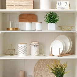 Vertikální uložení pokliček, talířů a prkének šetří místo a zajišťuje rychlý přístup ke každému kusu bez hluku a zbytečného přehrabování.
