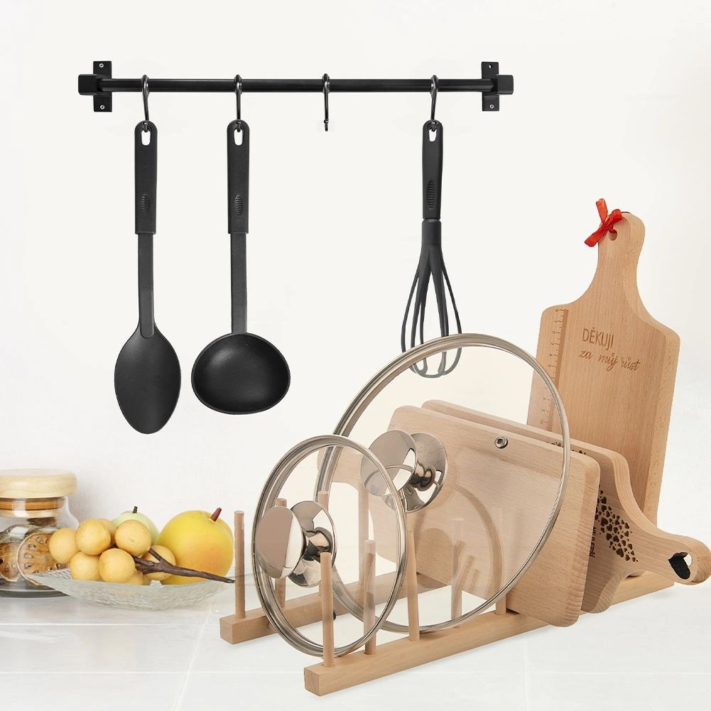 Uspořádejte pokličky, mělké i hluboké talíře a krájecí prkénka přehledně na jednom místě. Dřevěný stojan s osmi pozicemi udržuje nádobí ve svislé poloze, takže je ihned po ruce, lépe schne a nepřenáší se na něj vlhkost. Minimalistický vzhled a přírodní barva snadno zapadnou do jakéhokoli kuchyňského stylu.