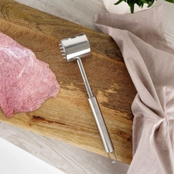 Vysoce odolná nerezová ocel zajišťuje dlouhou životnost, hygienu a snadné čištění v myčce. Tenderizér se hodí na hovězí, vepřové, drůbež i ryby, a poslouží i k drcení ořechů či ledu. Očko na konci rukojeti umožňuje praktické zavěšení a skladování.