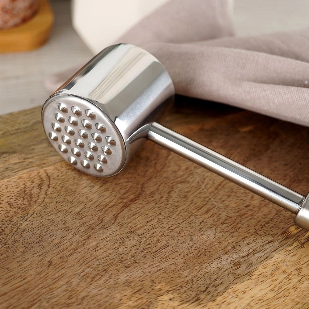 Robustní kuchyňský palič na maso z nerezové oceli je ideální pro přípravu steaků, kotlet i řízků. Hladká strana účinně zplošťuje plátky, zatímco strana s výstupky maso zjemní a naruší vlákna pro šťavnatější výsledek. Díky vyvážené hmotnosti a pohodlné rukojeti padne skvěle do ruky a práce je rychlá a přesná.