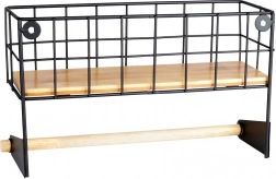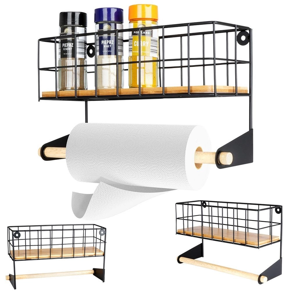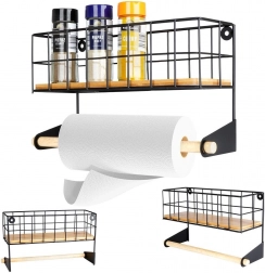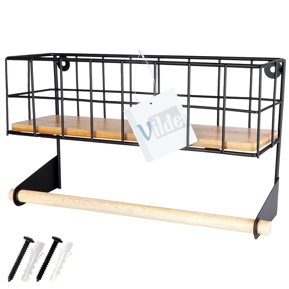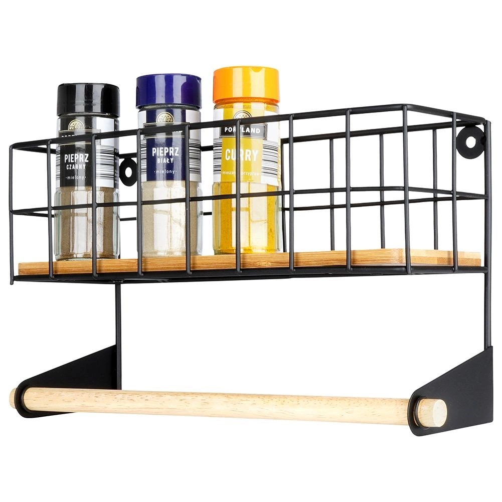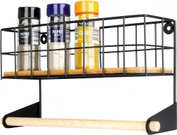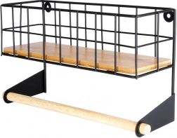 Tato nástěnná police s integrovaným držákem na papírové utěrky pomůže chytře zorganizovat kuchyň. Horní košík pojme kořenky či malé dózy, spodní dřevěná tyč zajistí pohodlné odvíjení utěrek. Odolné provedení z černě práškovaného kovu a bambusové doplňky dodají prostoru moderní industriální vzhled.