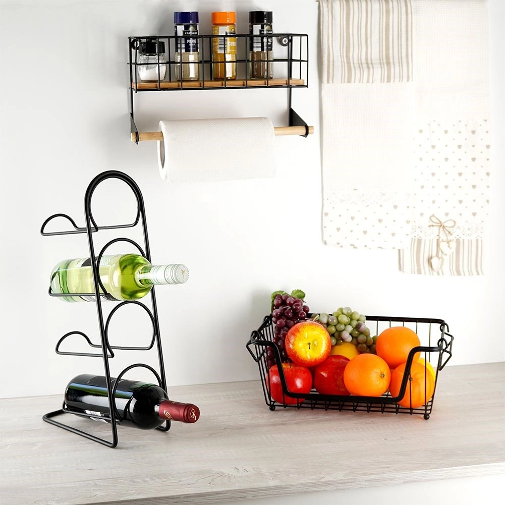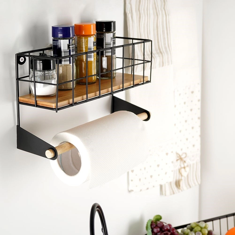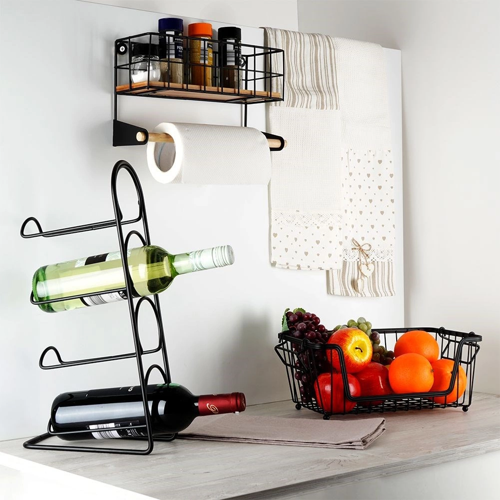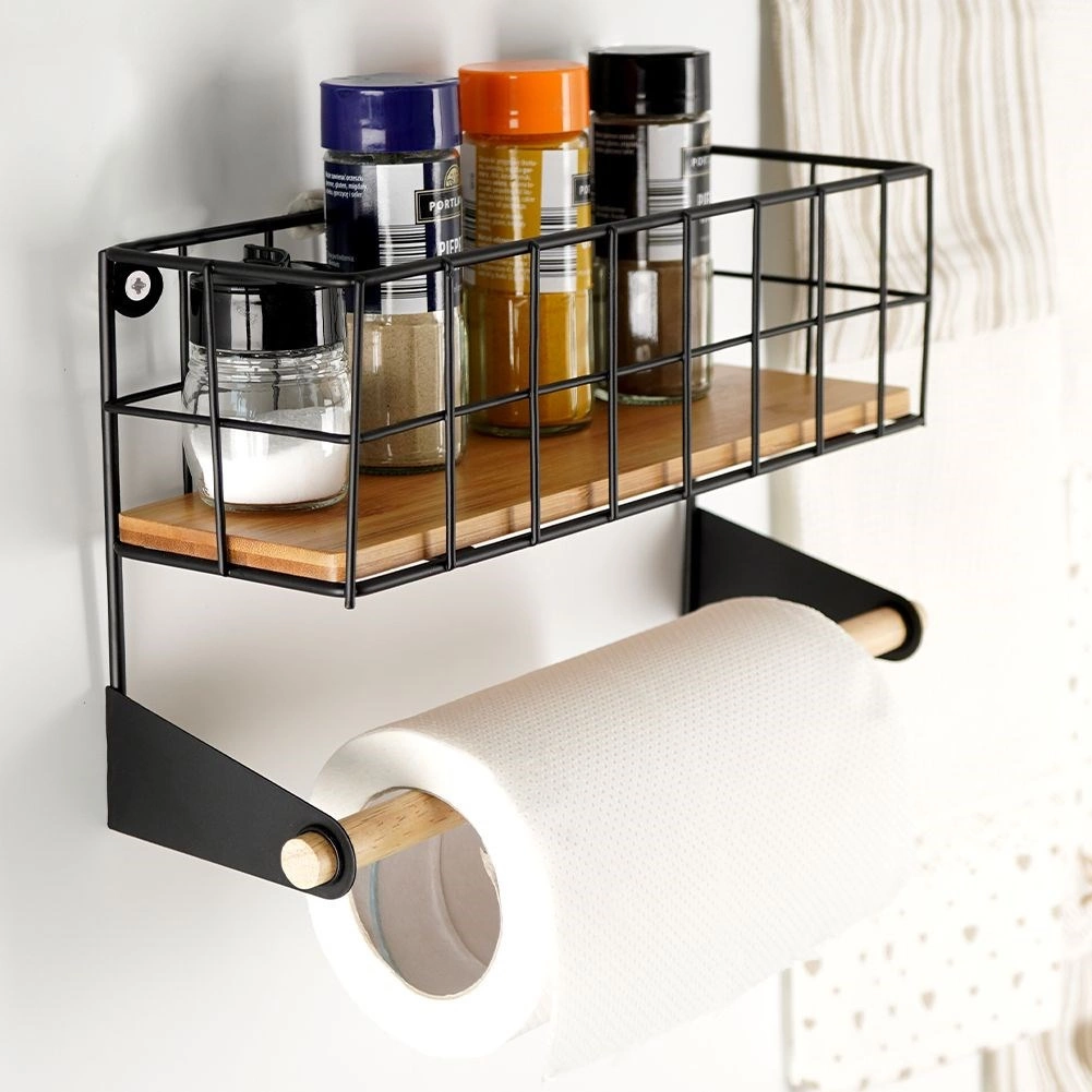 Tato nástěnná police s integrovaným držákem na papírové utěrky pomůže chytře zorganizovat kuchyň. Horní košík pojme kořenky či malé dózy, spodní dřevěná tyč zajistí pohodlné odvíjení utěrek. Odolné provedení z černě práškovaného kovu a bambusové doplňky dodají prostoru moderní industriální vzhled.