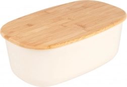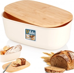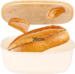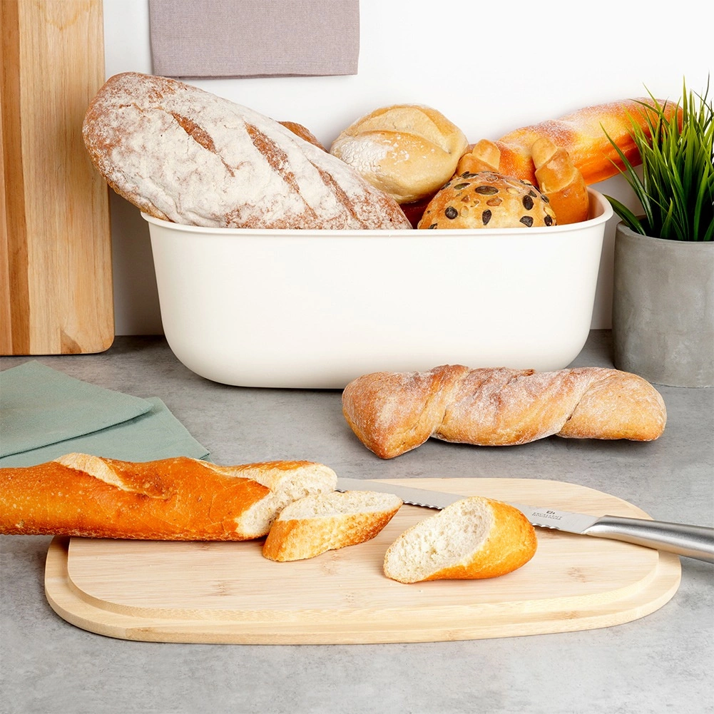 Stylový chlebník v krémové barvě kombinuje moderní design a přírodní bambus. Tělo je vyrobeno z odolného plastu bez BPA, víko z bambusového dřeva slouží jako praktické krájecí prkénko. Díky velkorysým rozměrům 39 × 23,5 × 15,5 cm pohodlně uložíte chléb, bagety i housky.