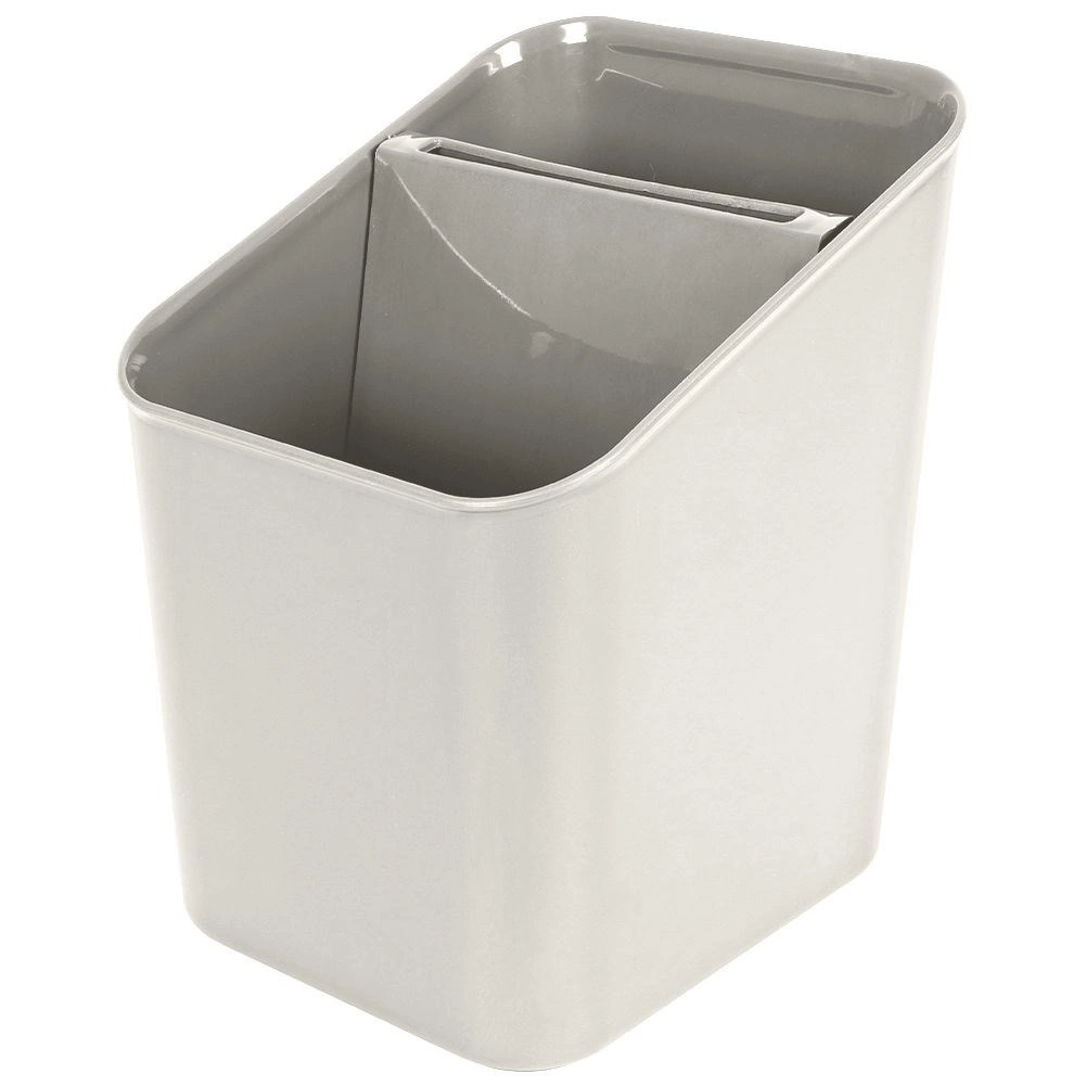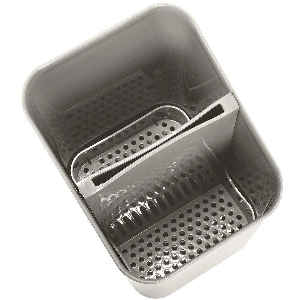 Udržte pořádek u dřezu i na pracovní desce. Tento odkapávač na příbory z kvalitního plastu v moderní šedé barvě kombinuje elegantní vzhled a maximální funkčnost. Vyjímatelný vložený díl vytváří dvě oddělené sekce a díky perforovanému dnu umožňuje odtok vody, aby příbory nestály ve vlhku.