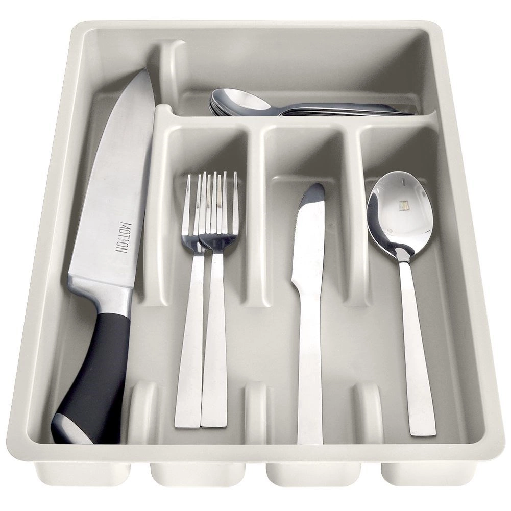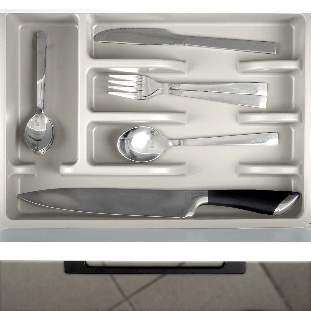 Vložka nabízí pět funkčních přihrádek: tři pro základní příbory, jednu pro čajové lžičky a jednu dlouhou pro metličky, škrabky či nože v pouzdře. Hladký povrch se snadno čistí a je vhodný do myčky, takže údržba je rychlá a bez starostí.