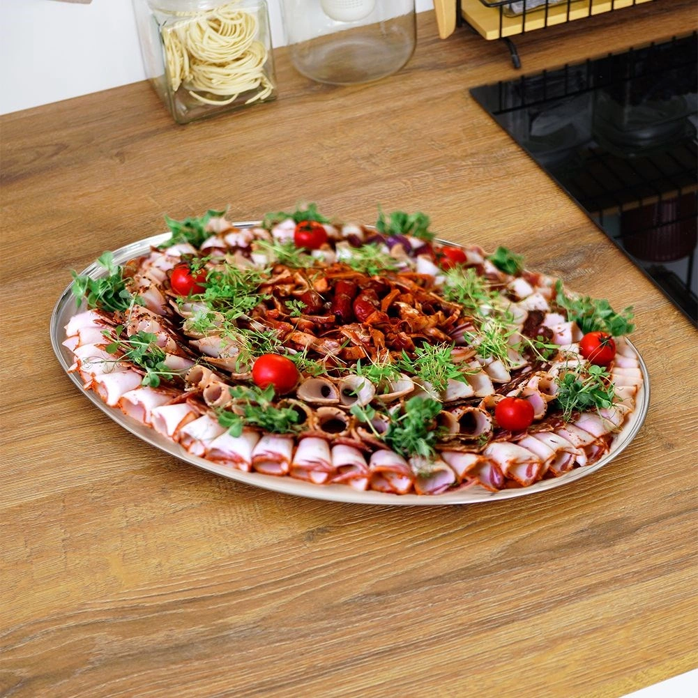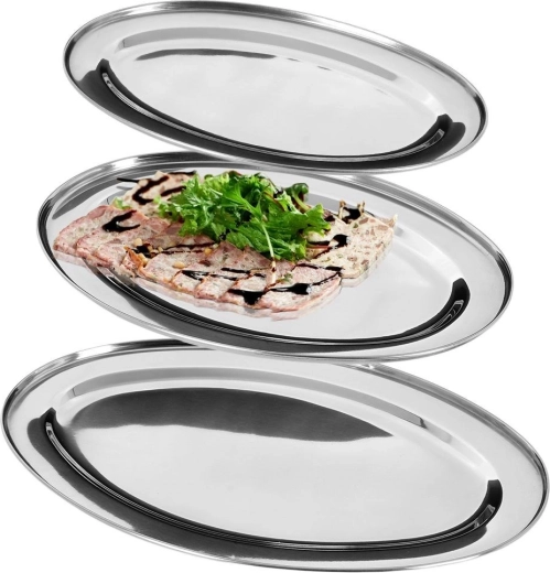 Elegantní sada tří oválných podnosů z nerezové oceli pro stylové servírování. Ideální na předkrmy, kanapky, ovoce i dezerty. Díky leštěnému povrchu, vyvýšenému okraji a odolnému provedení jsou skvělé pro domácnost i gastronomii.