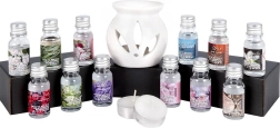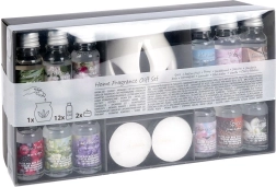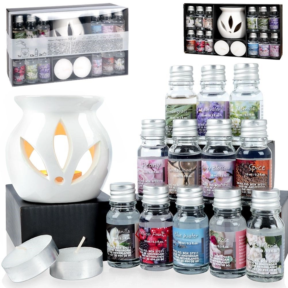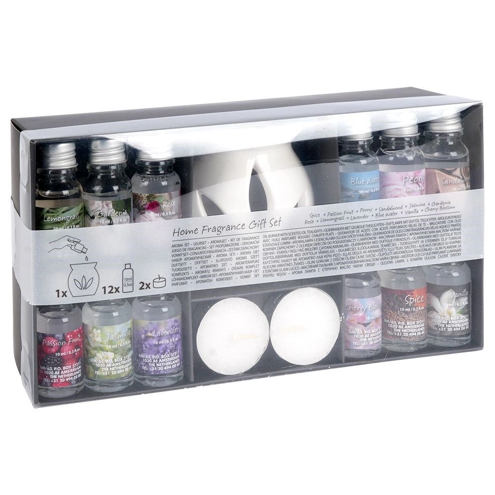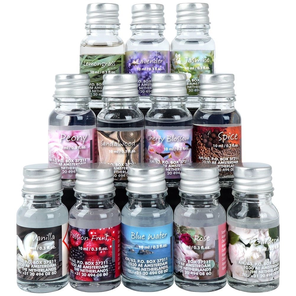 - 12× vonný olej 10 ml: Spice, Passion Fruit, Peony, Sandalwood, Jasmine, Gardenia, Rose, Lemongrass, Lavender, Blue Water, Vanilla, Cherry Blossom