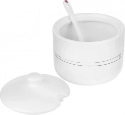 Elegantní bílá keramická cukřenka o objemu 300 ml s víčkem a lžičkou je praktickým doplňkem pro servírování cukru i koření. Jednoduchý design s jemnou linií a srdíčkem ozdobí každou kuchyni, víčko s výřezem na lžičku usnadňuje používání a skladování. Vhodná do myčky pro snadnou údržbu.