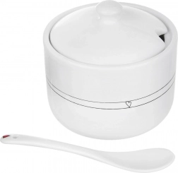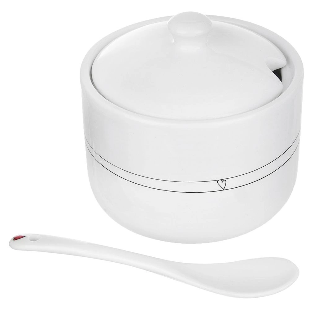 Tato stylová cukřenka v klasické bílé barvě kombinuje praktičnost a dekorativní vzhled. Díky víčku s výřezem zůstává obsah chráněný a lžička vždy po ruce. Jemný motiv linky se srdíčkem a drobný červený akcent na lžičce dodávají originální šmrnc.