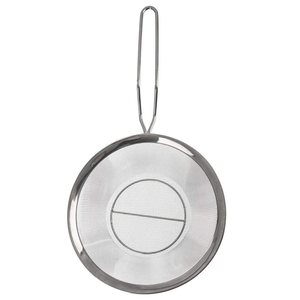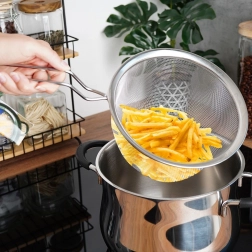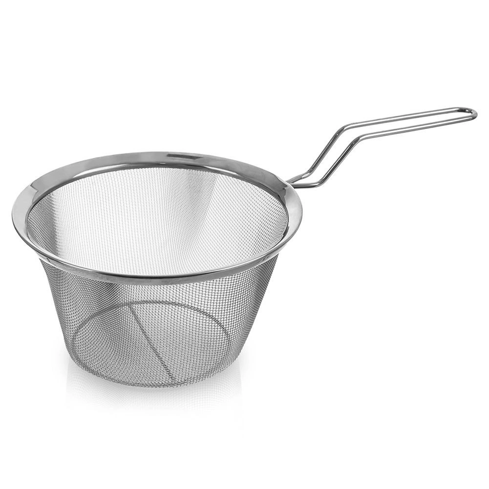 Fine mesh z nerezové oceli rychle odvodní těstoviny, zeleninu i hranolky a zabrání propadávání malých kousků.