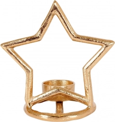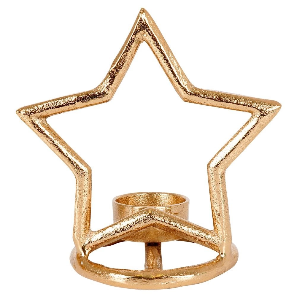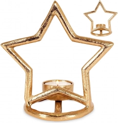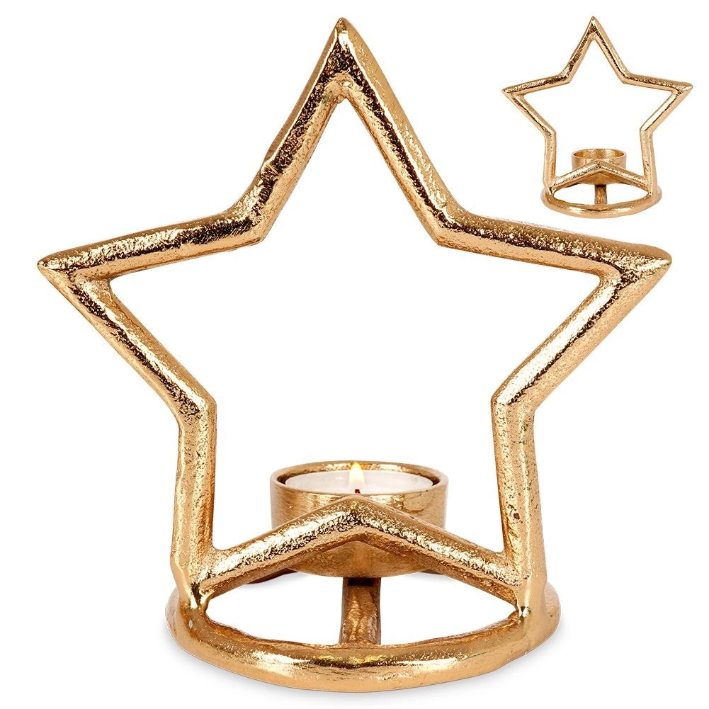 Elegantní svícen ve tvaru hvězdy z kvalitního hliníku v moderní zlaté barvě krásně rozzáří stůl, polici i komodu. Je ideální pro čajové svíčky (tealighty) a díky stabilní kruhové základně stojí bezpečně na jakémkoli povrchu. Minimalistický vzhled snadno sladíte s interiéry ve stylu LOFT, industriál i skandinávském.