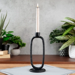 Decentní, ale výrazný doplněk pro každý domov. Svícen v černém provedení je určen na dlouhé svíčky do průměru 2 cm a díky pevné konstrukci z hliníku stojí spolehlivě a bezpečně. Minimalistická oválná silueta se snadno kombinuje s dalšími dekoracemi a podtrhuje atmosféru interiéru.