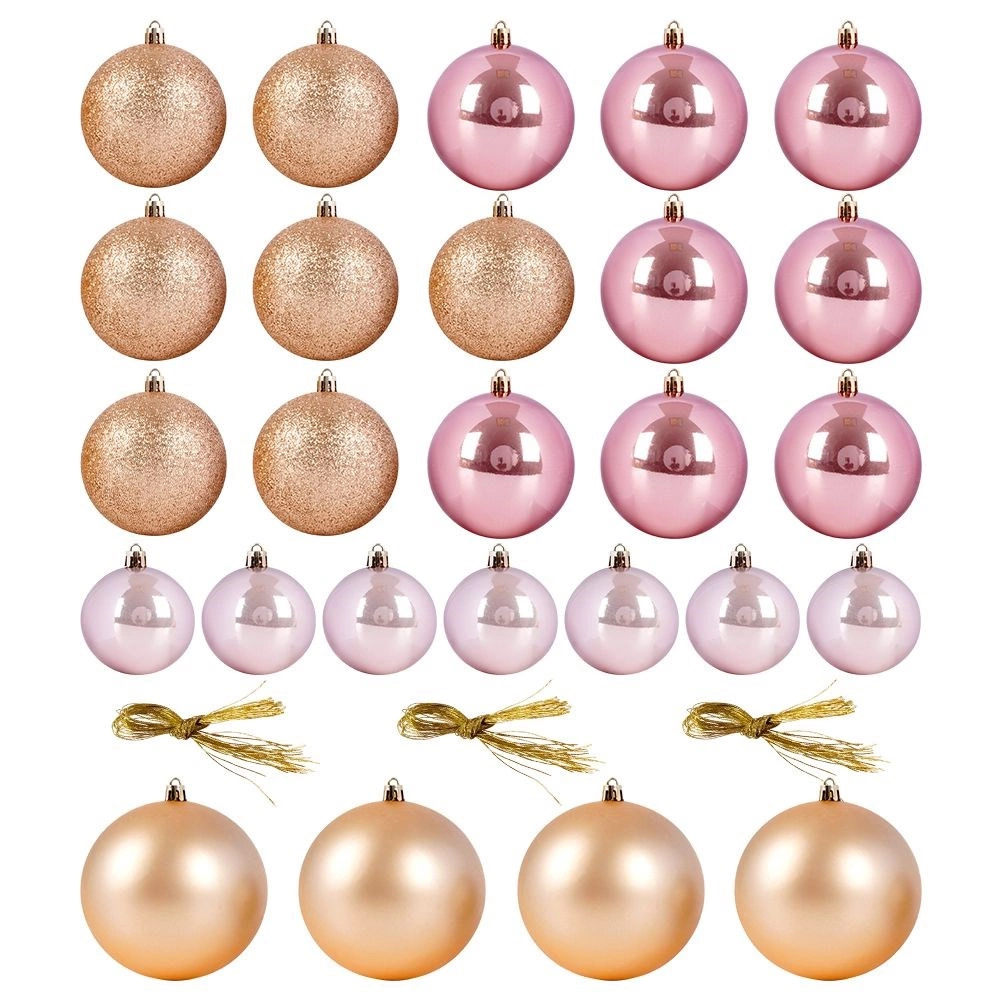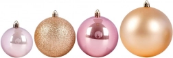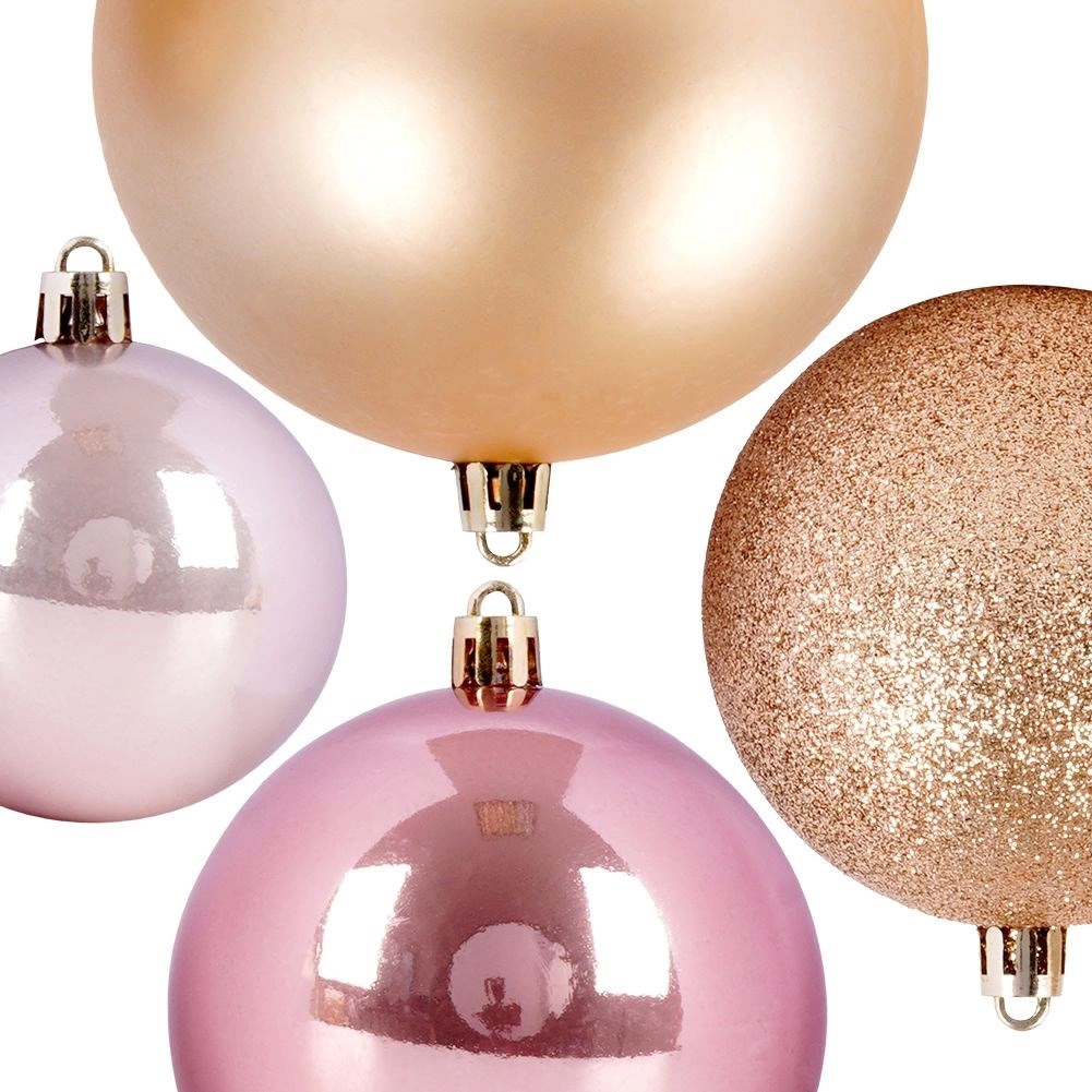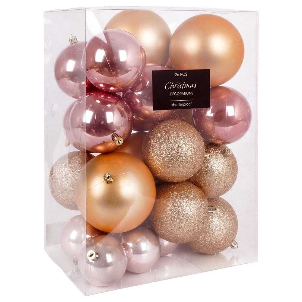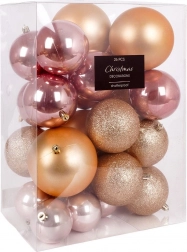 Elegantní sada 26 ks vánočních baněk v růžových a zlatavých tónech pro dokonalou sváteční výzdobu. Baňky jsou z kvalitního plastu, tedy neroztříštitelné, bezpečné pro domácnosti s dětmi a mazlíčky a vizuálně připomínají sklo. Kombinace matných, lesklých a třpytivých povrchů zajistí efektní lesk na každém stromku.