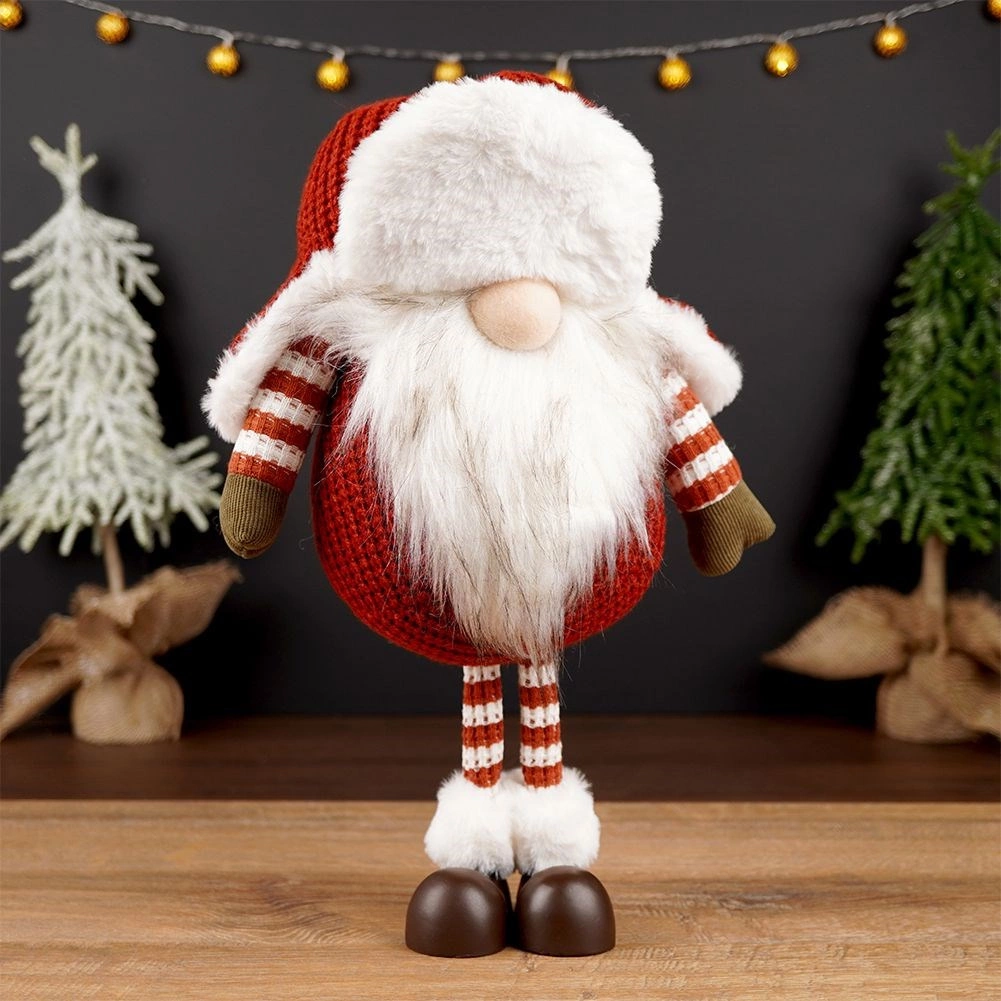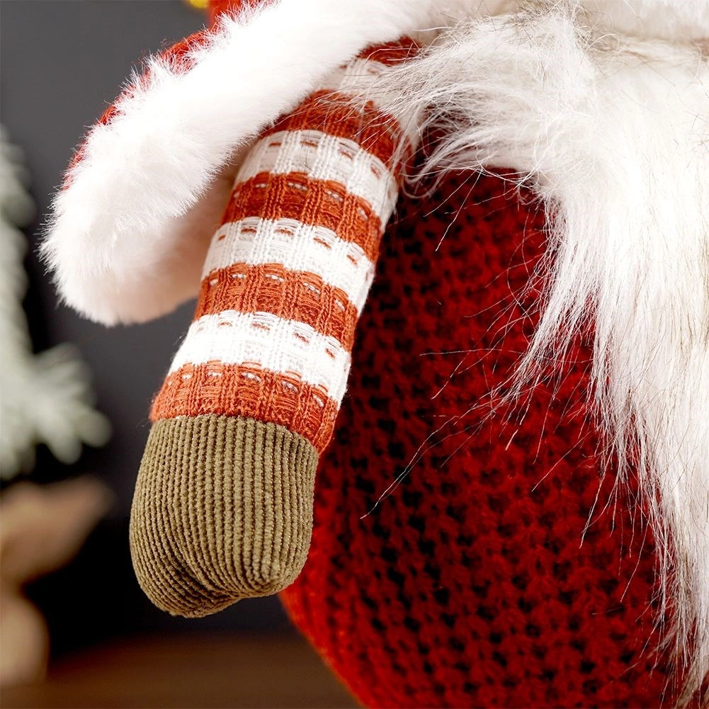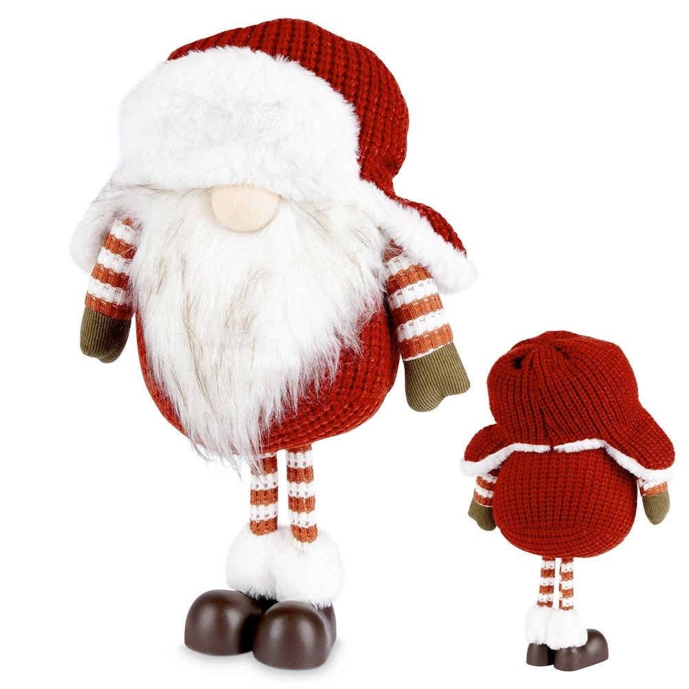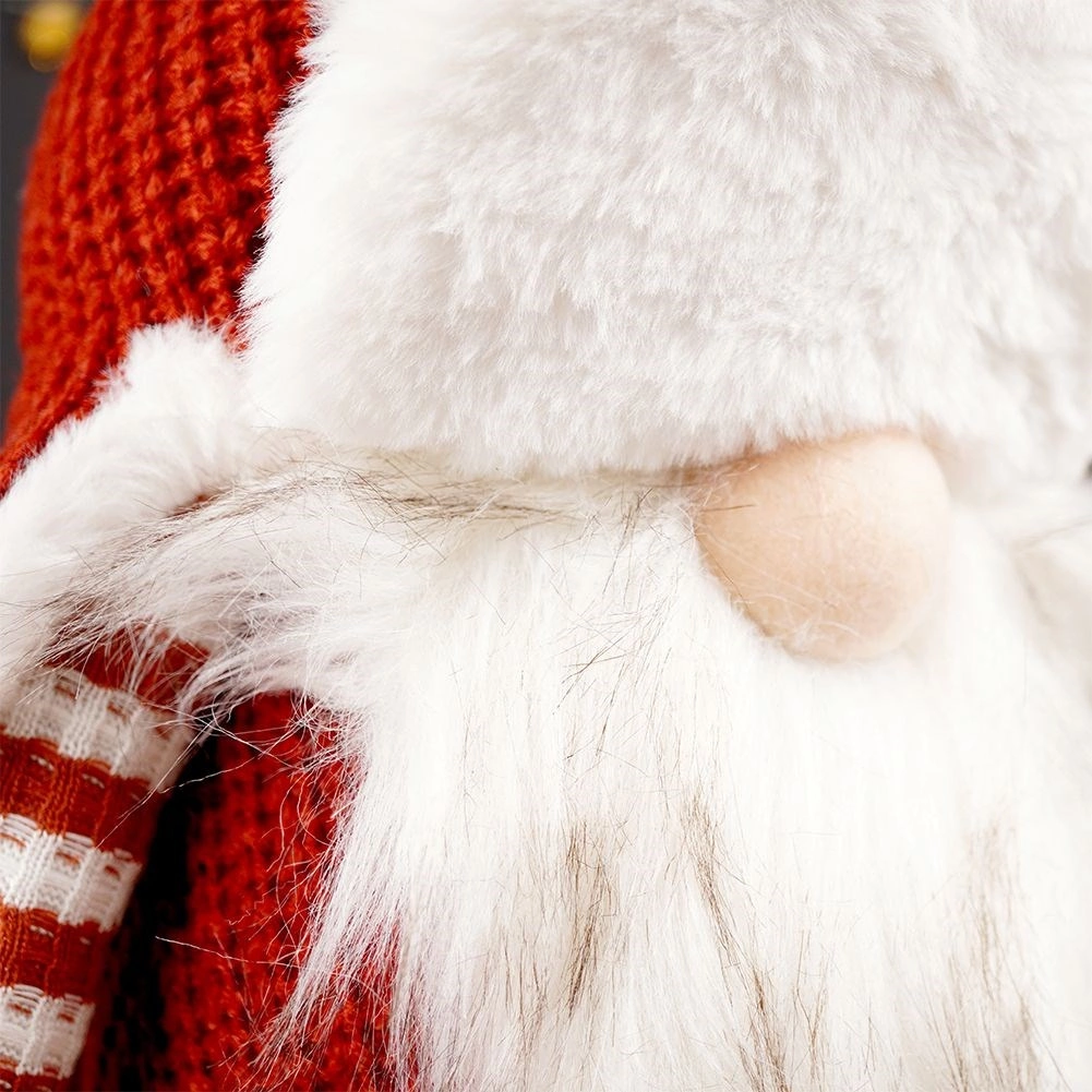 Červený pletený oděv, kožíškový lem a bohatý bílý vous dodají dekoraci hřejivý, tradiční vánoční nádech, který zapadne do každého interiéru.