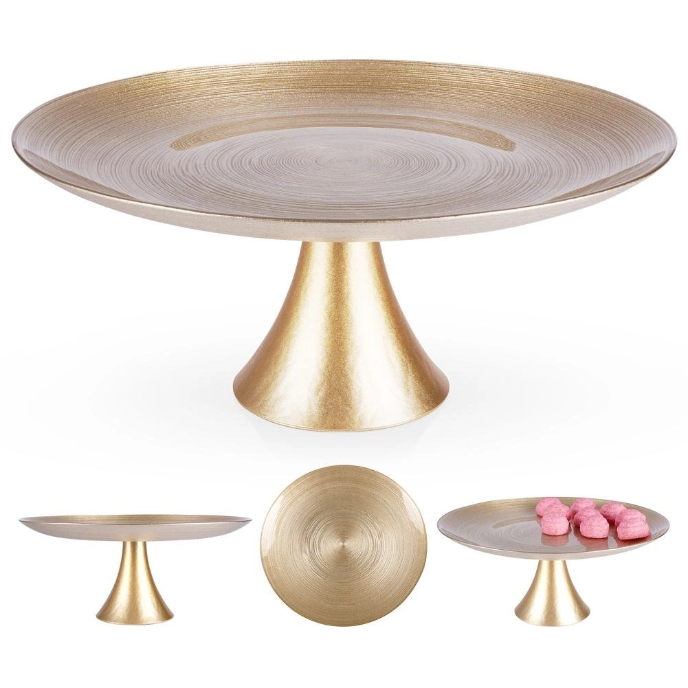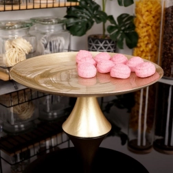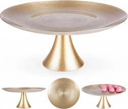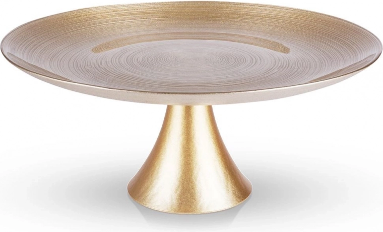 Elegantní skleněná patra na nožce o průměru 28 cm a výšce 11,5 cm je ideální pro servírování dortů, dezertů a občerstvení. Díky zlaté barvě a klasickému tvaru krásně vynikne na každém stole a efektně zvýrazní sladkosti. Pro zachování vzhledu se nedoporučuje mytí v myčce.