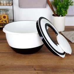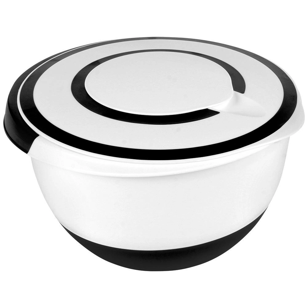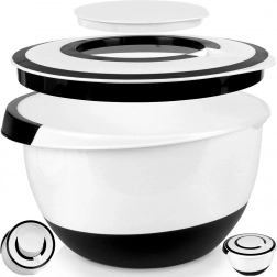 Praktická kuchyňská mísa s dvoudílným víkem o objemu 5 l pro pohodlné míchání, šlehání a mixování bez rozstřikování. Odolné provedení, protiskluzová základna, nalévací zobáček a možnost mytí v myčce usnadní každodenní vaření.