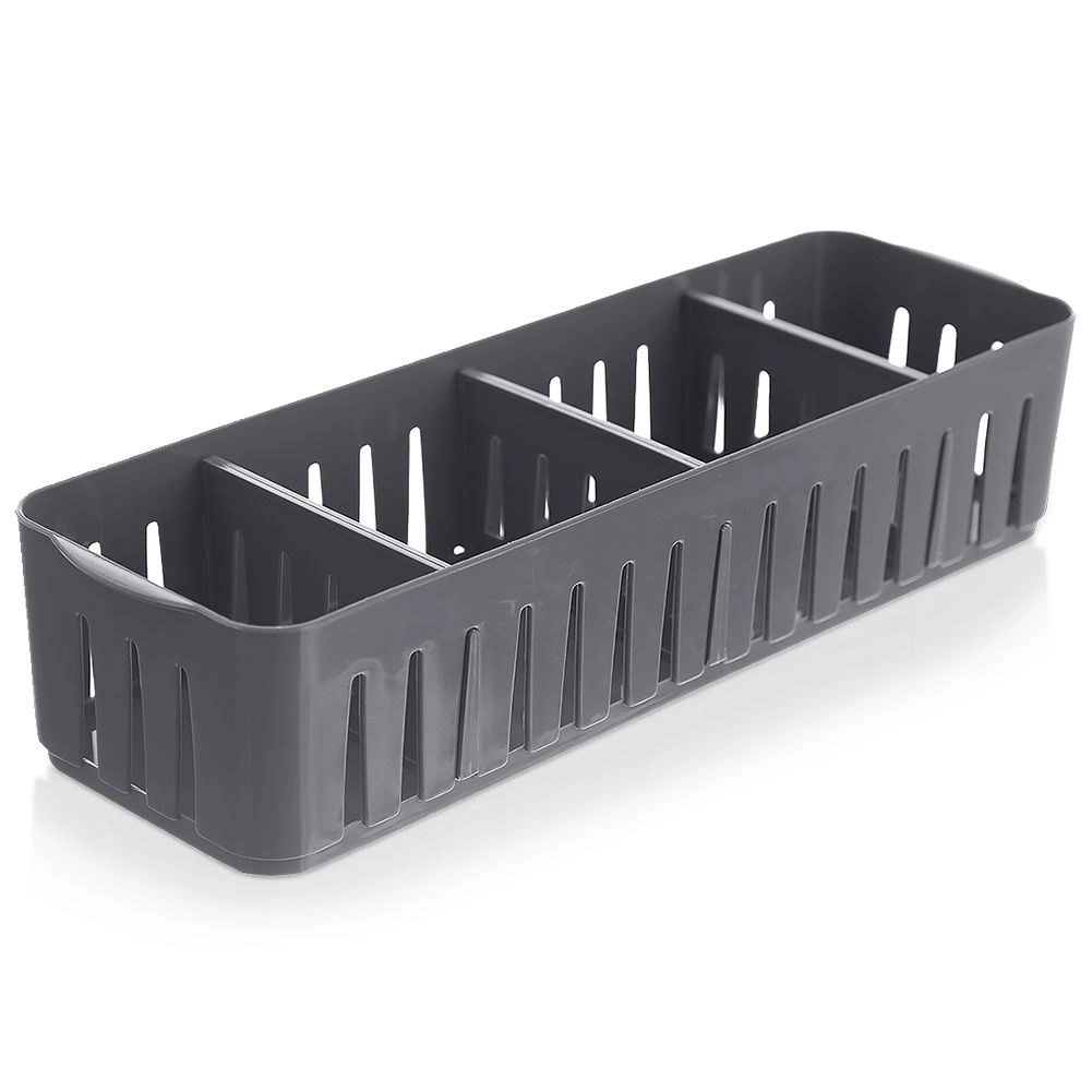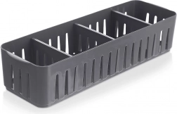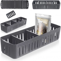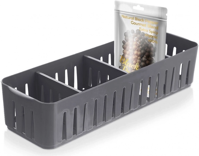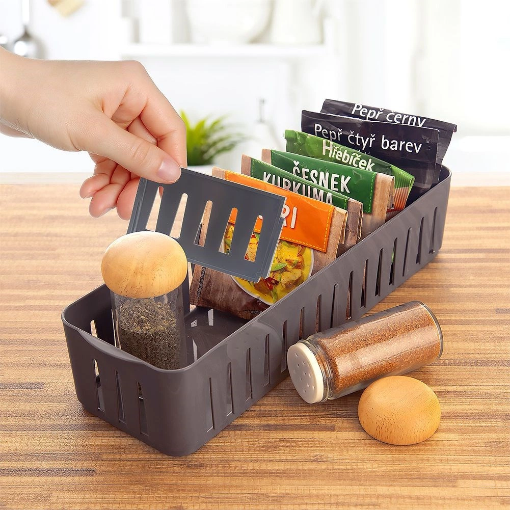 Praktický kuchyňský organizér na koření s vyjímatelnými přepážkami udrží vaše sáčky s kořením přehledně na jednom místě. Je z odolného, lehkého plastu v šedé barvě a díky rozdělení na čtyři sekce snadno roztřídíte koření podle typu. Hodí se do skříňky, zásuvky i na pracovní desku a lze jej mýt v myčce. Přehledné třídění, pevné provedení, snadná údržba.