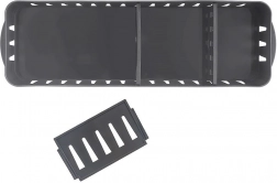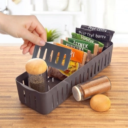 Udělejte pořádek mezi sáčky s kořením a bylinkami. Tento šedý organizér s kompaktními rozměry nabízí promyšlené rozdělení prostoru a udrží i otevřené sáčky bezpečně ve svislé poloze – bez vysypávání a chaosu v zásuvce. Díky vyjímatelným přepážkám si uspořádání snadno přizpůsobíte.