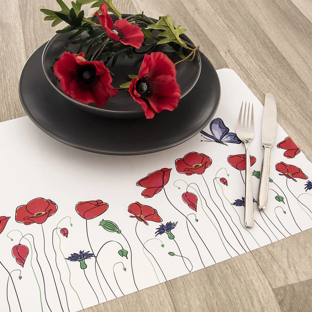 Praktické a dekorativní prostírání v bílé barvě s výrazným motivem červených máků a jemným detailem motýla krásně doplní vaši jídelní soupravu. Díky obdélníkovému tvaru se perfektně vejde pod talíř a dodá stolování harmonický vzhled.