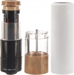 Moderní elektrický mlýnek na sůl, pepř a další koření s výškou 23 cm kombinuje elegantní design s praktickými funkcemi. Nabízí keramický mlecí mechanismus pro přesné mletí, plynulou regulaci hrubosti, LED osvětlení pro kontrolu dávky a pohodlné ovládání jednou rukou. Bílá konstrukce s dřevěným dekorem skvěle doplní každou kuchyni.