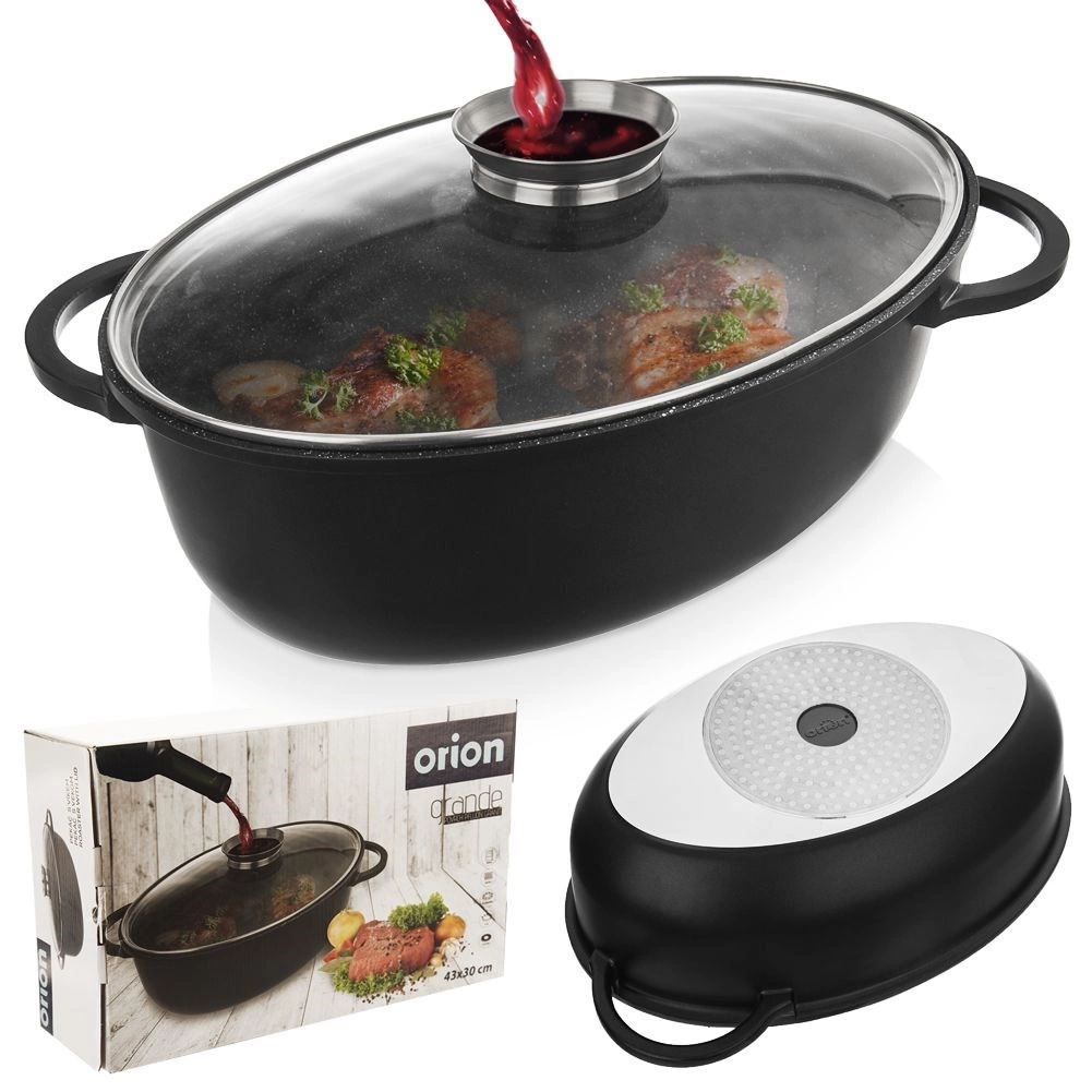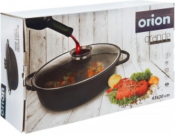 V balení najdete 1× hluboký oválný pekáč (vnější rozměry 45 × 27,5 × 13 cm, vnitřní 37,5 × 25 × 13 cm, objem 8 l) a 1× skleněné víko (vnější rozměry 39 × 26,5 × 7 cm). ORION – originální produkt české značky vyrobený v souladu s evropskými standardy.