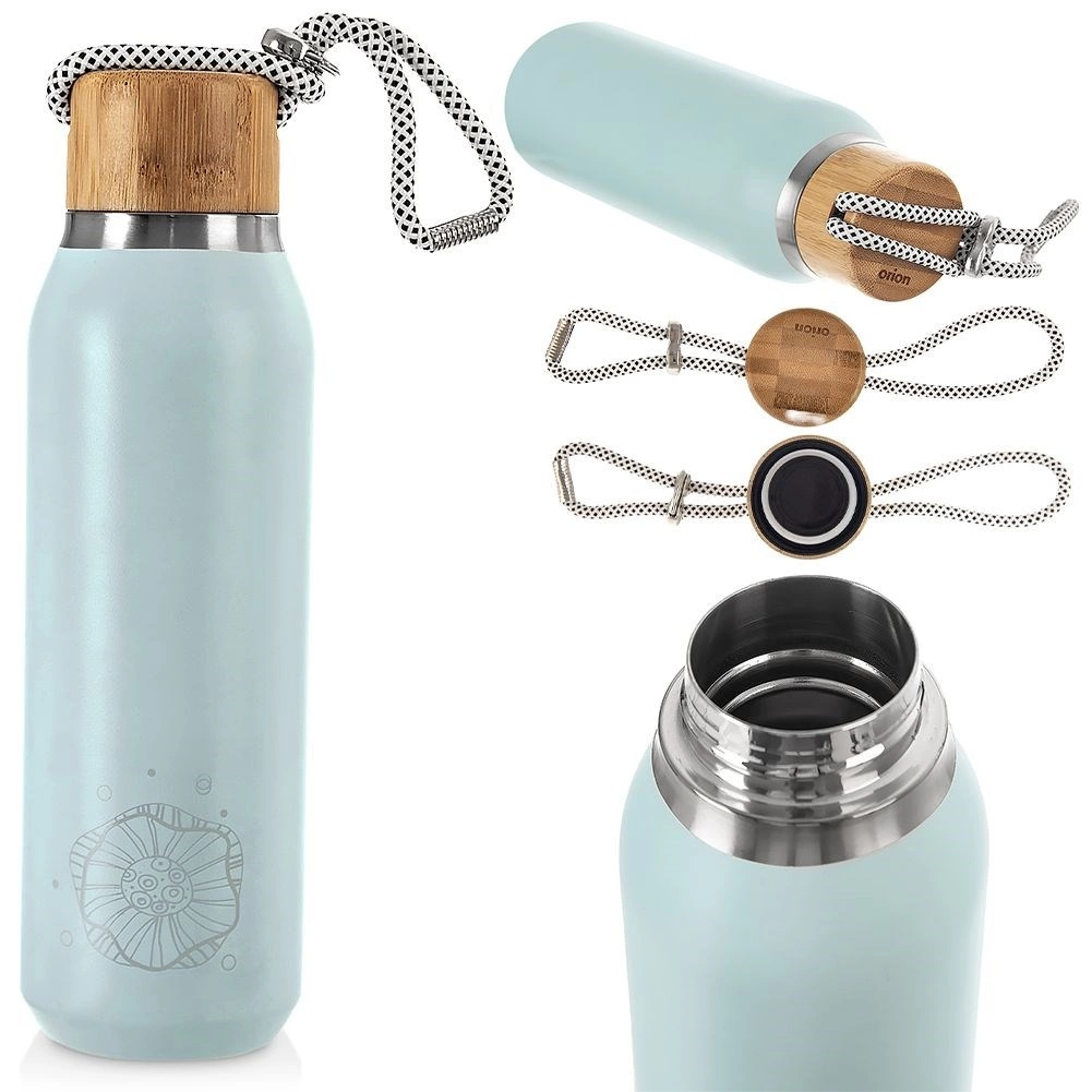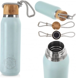 Přírodní bambusový uzávěr se šroubovacím závitem a silikonovým kroužkem zaručuje těsnost. Integrovaná šňůrka usnadňuje nošení i zavěšení.
