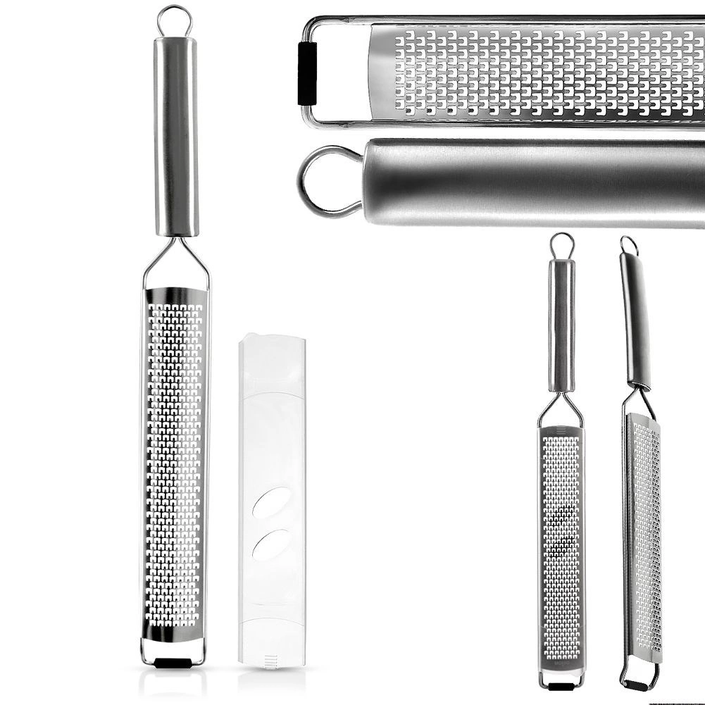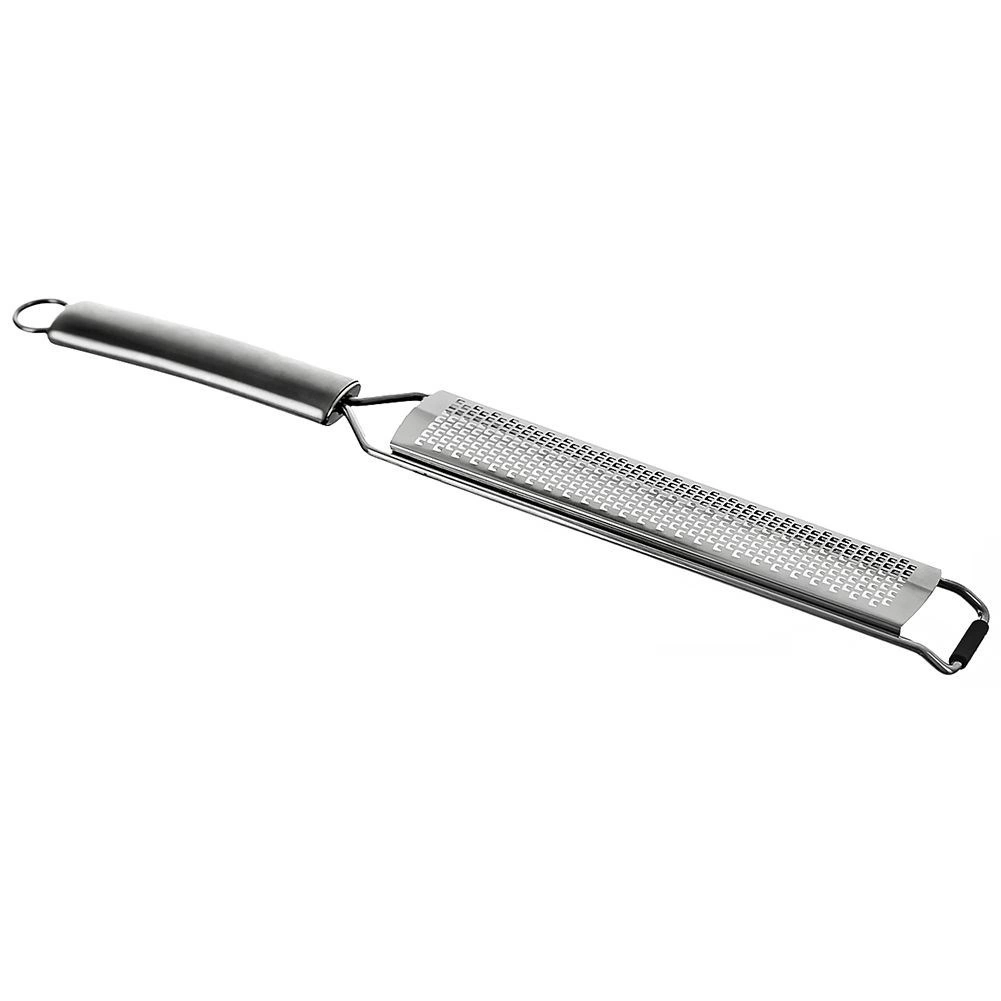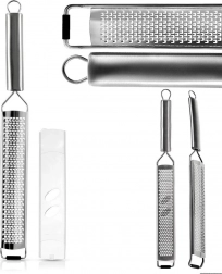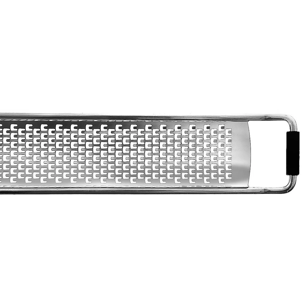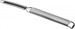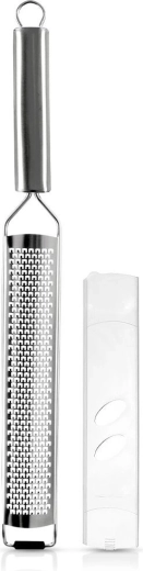 Praktické ploché struhadlo z nerezové oceli o délce 38 cm a šířce 4 cm s jemnými ostrými zuby pro precizní strouhání. Skvělé na citrusovou kůru, tvrdé sýry, česnek, čokoládu či koření. Díky protiskluzové koncovce nepoškrábe nádobí, má dlouhou rukojeť s okem na zavěšení a součástí je ochranné pouzdro pro bezpečné skladování. Lze mýt v myčce nádobí.