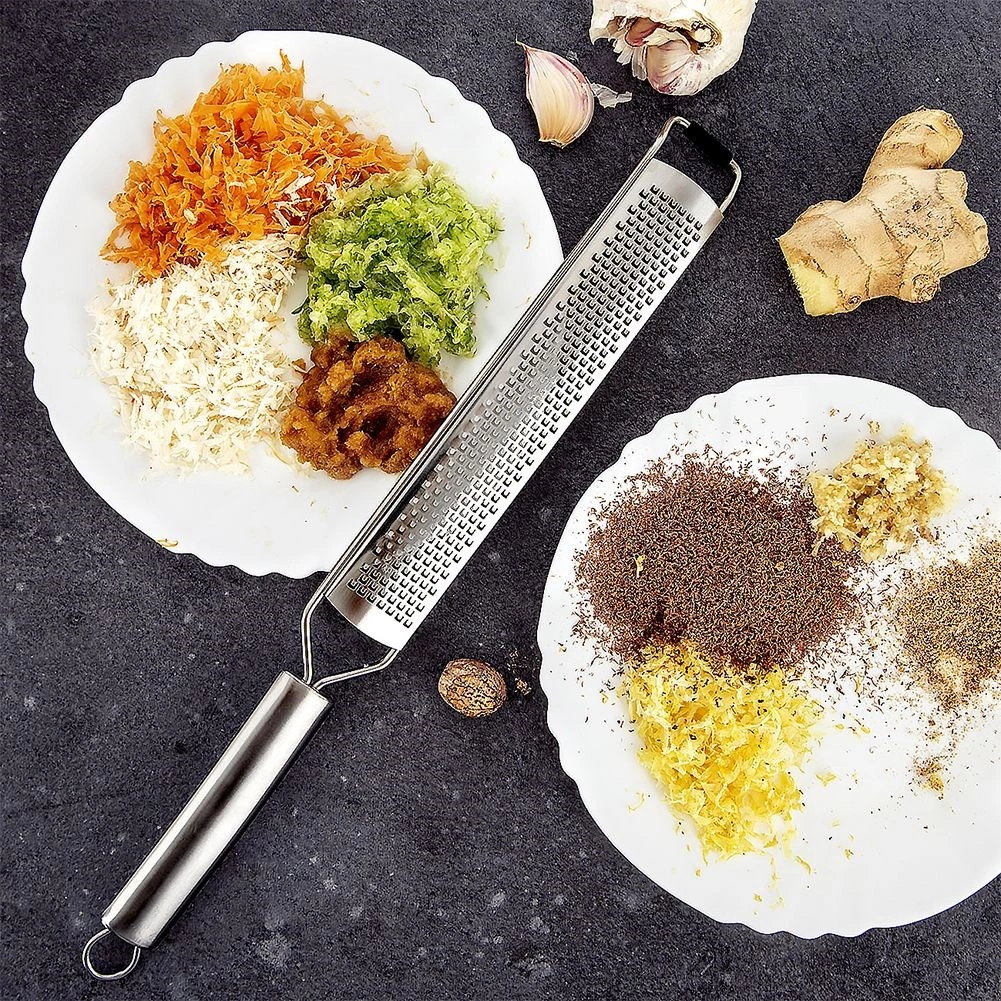 Elegantní a odolné ploché struhadlo z nerezové oceli s jemnou rasou je ideální pro každodenní vaření i pečení. Díky dlouhé úchopné části se pohodlně drží a umožňuje plynulé, rovnoměrné strouhání bez námahy. Protiskluzová gumová koncovka chrání pánve a hrnce před poškrábáním a zajišťuje stabilitu při práci.