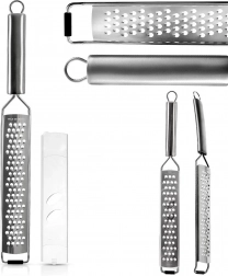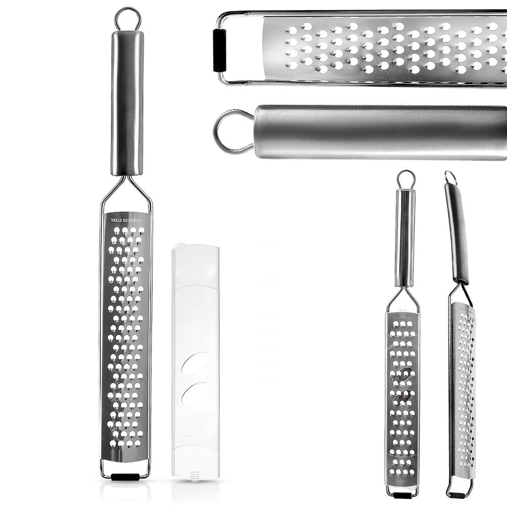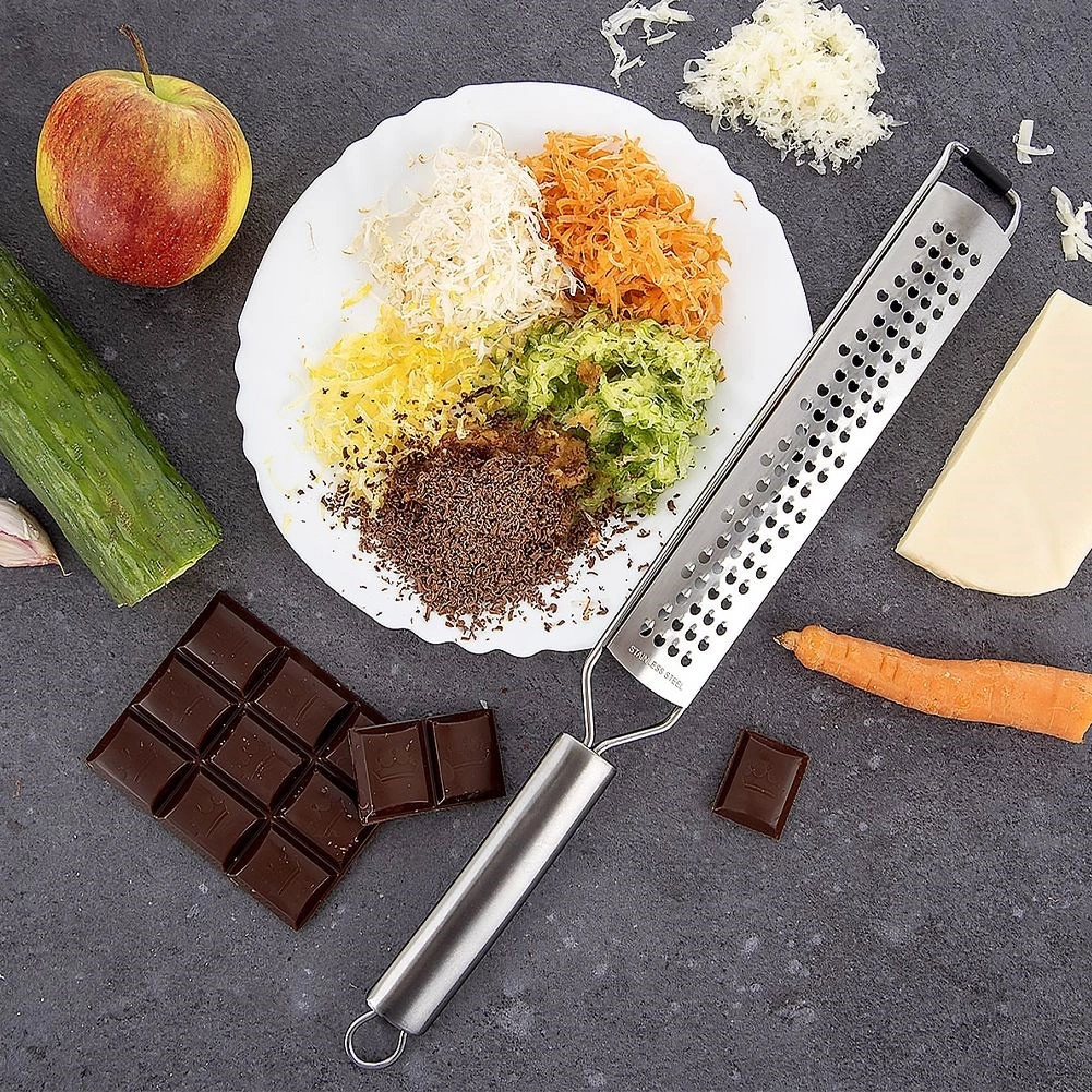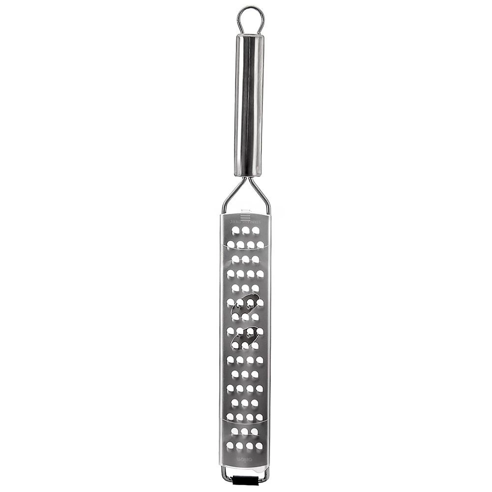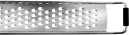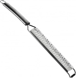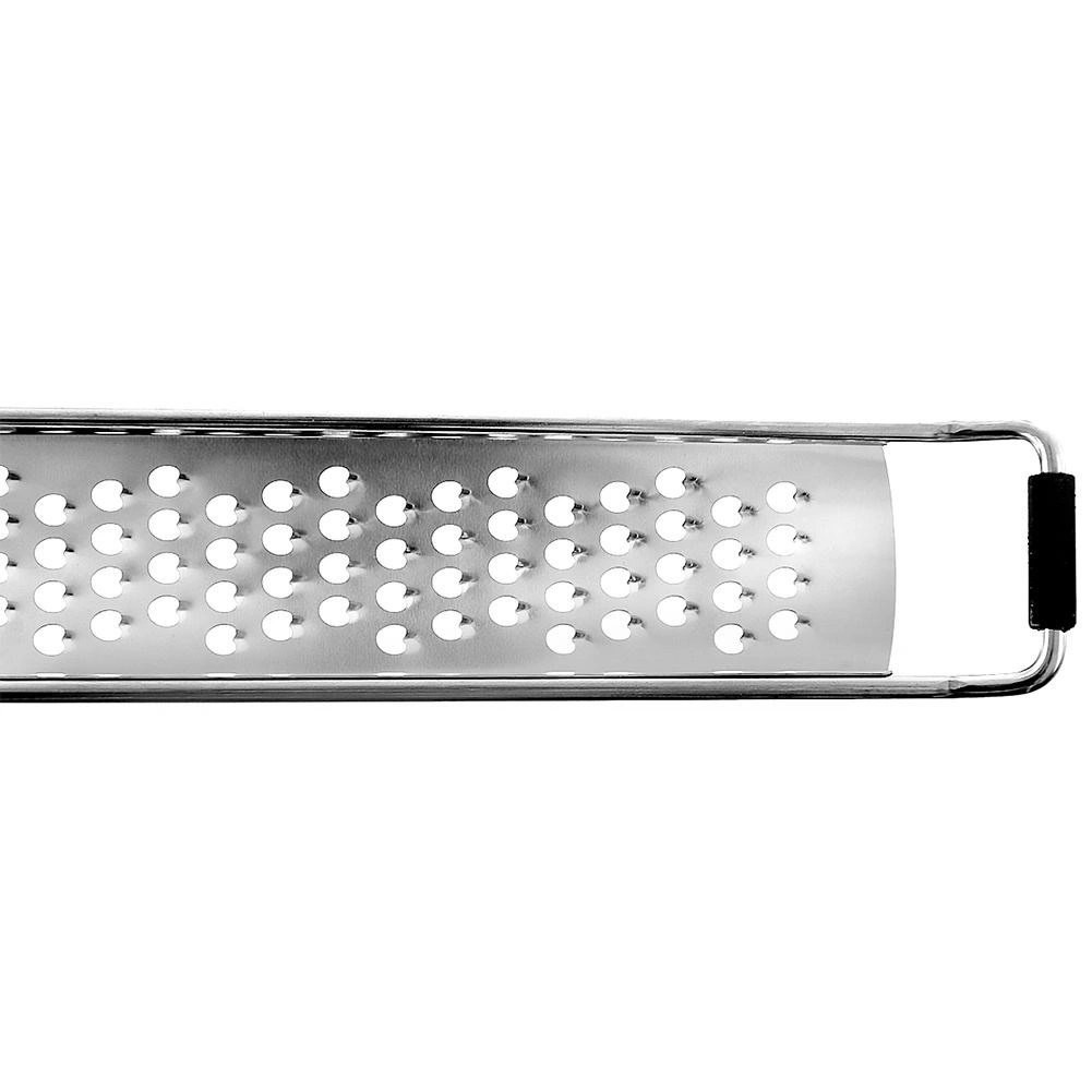 Praktické ploché struhadlo z nerezové oceli o délce 38 cm a šířce 4 cm pro rychlé a rovnoměrné strouhání. Díky ostrým otvorům snadno nastrouháte zeleninu, tvrdé sýry, česnek, ořechy i citrusovou kůru. Má dlouhou rukojeť s očkem na zavěšení, protiskluzovou koncovku pro bezpečné použití na nádobí a ochranné pouzdro pro bezpečné uložení. Vhodné do myčky.