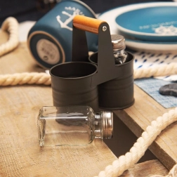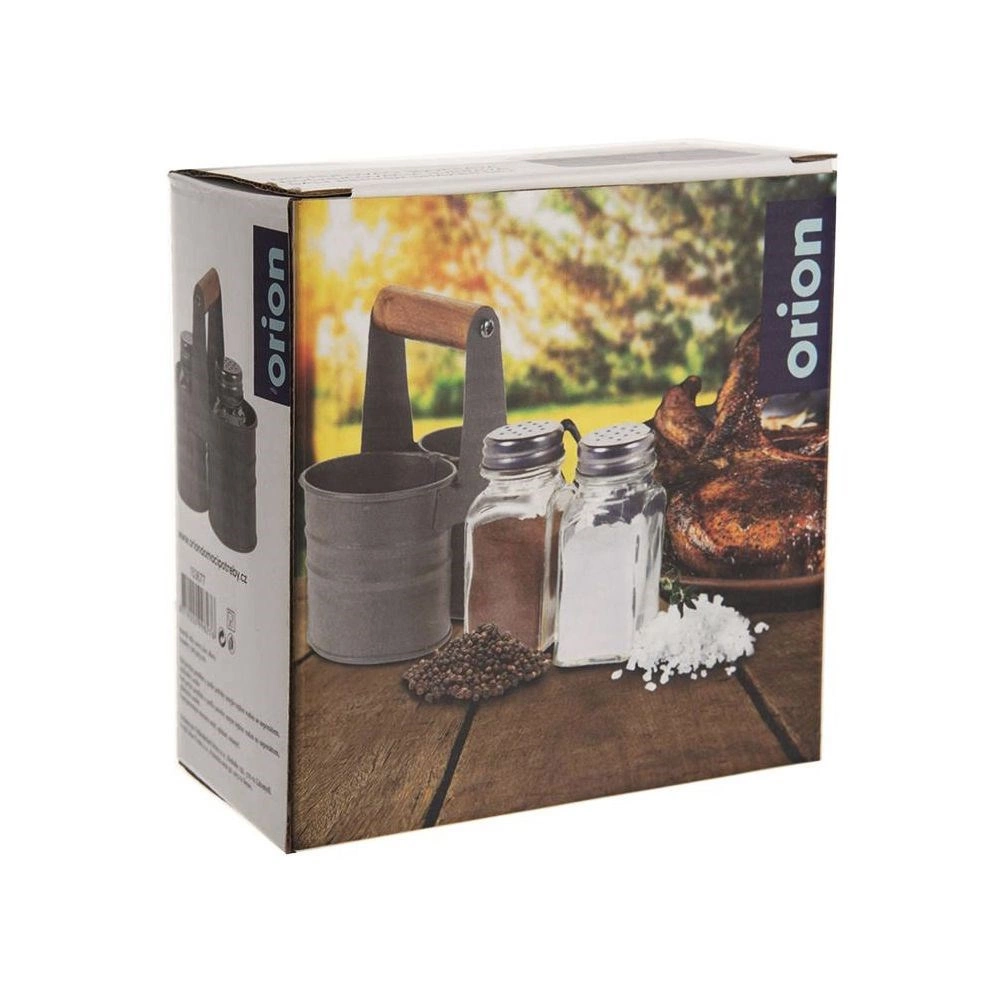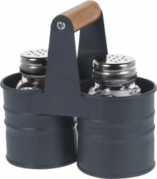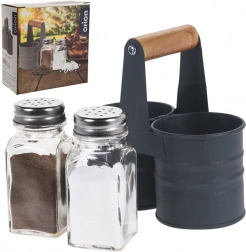 Stylový set pro každodenní dochucování: dvě čtvercové skleněné kořenky s odolnými nerez víčky ve stabilním kovovém stojanu. Dřevěná rukojeť zajistí bezpečné a pohodlné přenášení po kuchyni i jídelním stole. Díky průhlednému sklu máte vždy přehled o množství soli a pepře.